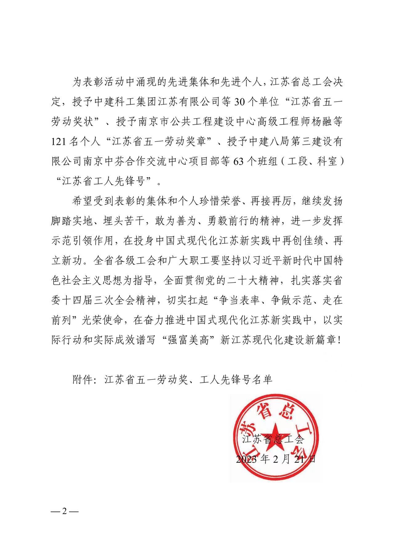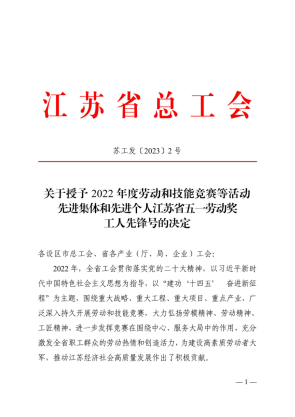 日前,江苏省总工会发布了苏工发〔2023〕2号《关于授予2022年度江苏省劳动和技能竞赛先进集体、先进个人江苏省五一劳动奖、工人先锋号的决定》,公司郑绍元同志荣膺“江苏省五一劳动奖章”。