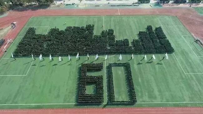 在军训汇演中同学们更是摆出特殊方阵,庆贺淮工60周年,赢得全场的阵阵掌声。董事长孙爱武、中国人民解放军73106部队副政委于录为获奖单位颁奖,以此表彰优秀团体。