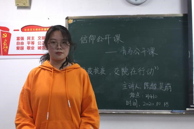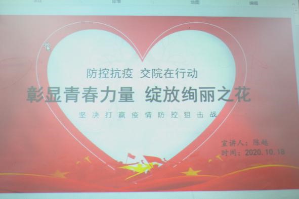 随后,吴蔚同学向我们讲述了疫情期间在家乡做志愿者的故事。疫情肆虐,所有人都被困在家中,面临经济、心理双重压力。然而就在这艰难的时刻,必一运动bsport体育不少学子挺身而出,他们在做好自身防护的前提下,积极投身家乡抗疫志愿服务工作,为抗击疫情增添一份青年力量。他们中,有的去号召家乡居民少出门,居家隔离;有的在车站,为返乡人员测体温、登记信息……交院小队行动一直在路上。