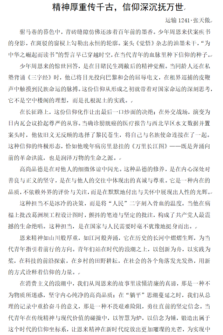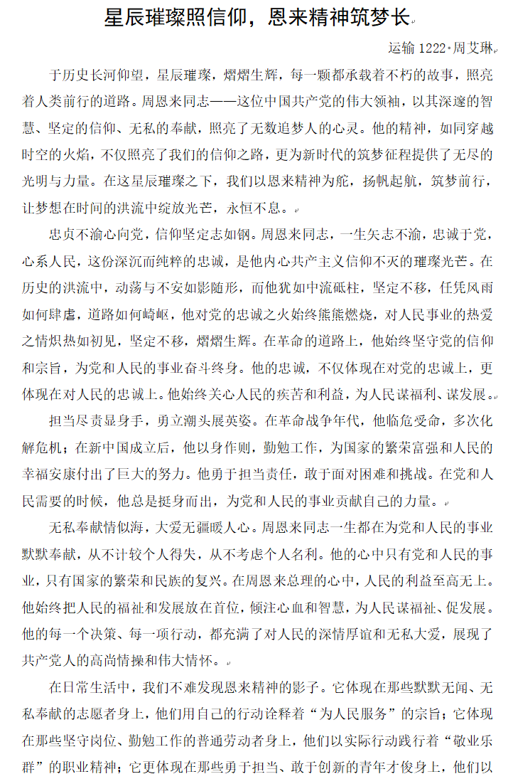 通过征文活动,展现了同学们对于文字运用的娴熟。同学们以“学恩来精神,筑信仰之基”为主题进行文章创作,不仅表达了对周总理无私奉献、一心为民精神的歌颂,更促使同学们对周总理高尚人格的学习。