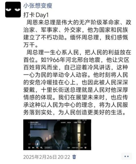 通过打卡活动,展现了同学们对坚持品格的淬炼,同学们以“缅怀伟人,展望未来”为主题每日影视打卡,不仅在时光刻度里追寻周总理“愿相会于中华腾飞世界时”的宏愿印记,更促使同学们瞄定新时代青年的奋进坐标。