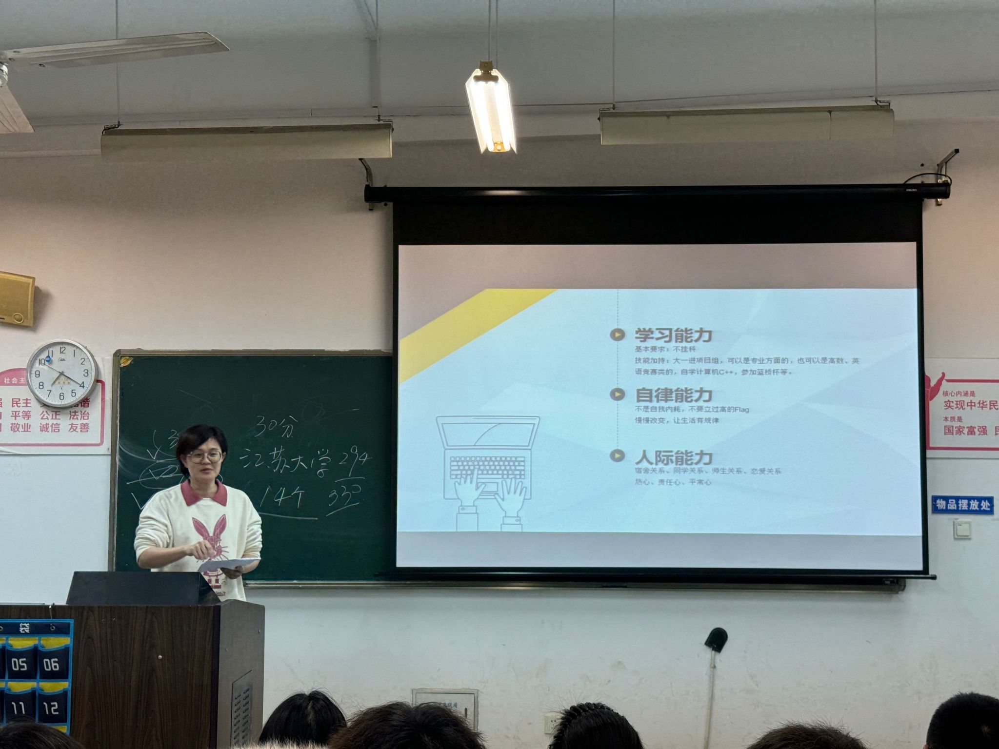 韩笑老师借一段视频向同学们提出了“有没有规划?、大学四年该做什么?、准备好了吗?”三连问,引起了同学们的自我反省。接着对“认知自我”“学业规划”“职业探索”“成就自我”四个方面进行了详细的讲解剖析,并通过“学习能力”“自律能力”“人际能力”三个“能力”指导各位同学在进入大学后应当如何正确的进行自我认知、合理制定学习目标、顺利完成职业规划。为同学们带来了一节丰富充实、受益良多的团课。