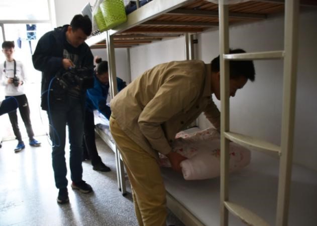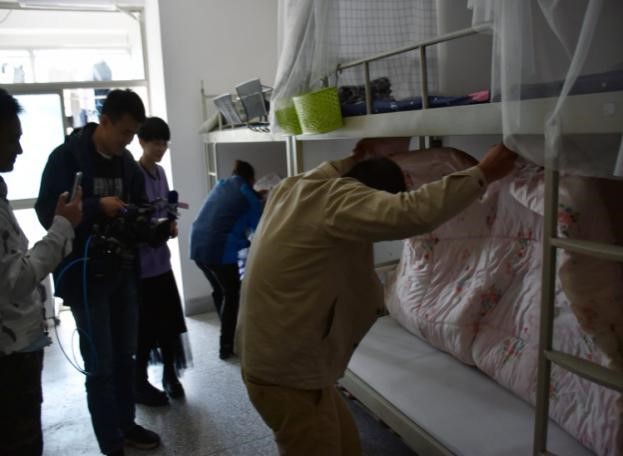 采访开始后,记者团跟随着戴阿姨的指引来到杨宇杰同学的宿舍。刚入门,记者团便对杨宇杰同学的“豆腐块”被子表现出惊讶并产生了浓厚的兴趣。采访中,当记者问杨宇杰同学平时是否也是如此叠被子时,杨宇杰同学表示:由于自己在高考结束后参加应征入伍,在这期间养成了叠被子的好习惯,所以自己每天早上都要花费十分钟叠出“豆腐块”被子。随着采访的跟进,杨宇杰同学又表示:入伍当兵后再进校园,自己还是可以很好适应的。在部队的两年时间内,军旅生活在一定程度上提高了他的适应能力。杨宇杰同学说:“部队培养了他,有些东西就要刻在骨子里。”同时,杨宇杰同学也深刻地表达了对部队、公司和老师的感谢。