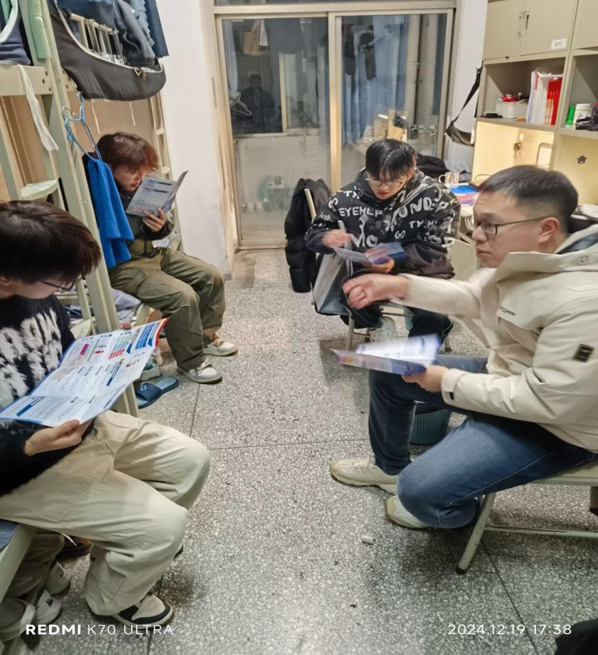 辅导员冯科儒走进员工宿舍,为同学们介绍老员工参军政策、军旅生涯发展和入伍条件等内容,并为意向参军的员工答疑解惑,详细讲解入伍流程和相关注意事项。
