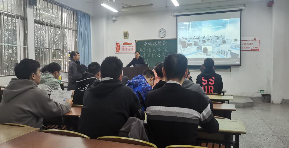 招聘会正式开始前,公司党委副书记、副经理余文明对到场毕业生进行了动员讲话。招聘会上,公司主讲人首先通过播放几段宣传视频让同学们对南京恒天领锐汽车有限公司有了基本的了解,然后通过PPT进一步介绍了公司情况。此外,该公司统招全日制2021届本科、硕士毕业生,学习成绩在本专业属于中上等以上、曾取得校级奖学金者优先录用,且公司司薪资福利待遇优厚。最后,公司负责人对提交简历的同学进行了面试。
