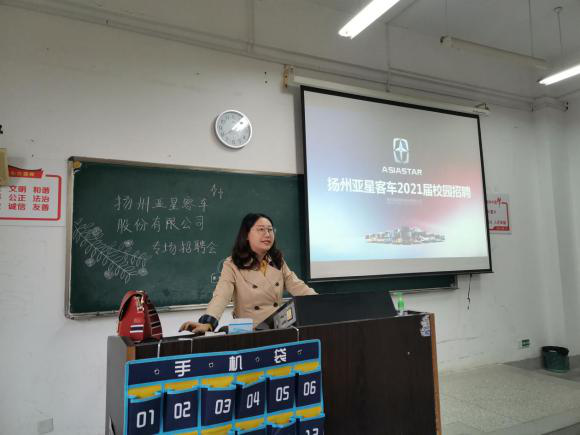 招聘会中,主讲人先播放一段视频宣传公司,让毕业生对公司有了简单的认识与了解。然后,公司负责人以ppt的形式详细介绍了关于我们:扬州亚星客车股份有限公司坐落于风光秀丽的古城扬州,是一个在市场经济激烈竞争中脱颖而出的“国家火炬计划重点高新技术企业”。1998年9月,经江苏省人民政府批准,以中国最大的客车生产企业江苏亚星客车集团有限公司为主发起人,发起设立了扬州亚星客车股份有限公司。2011年潍柴集团入主亚星后,亚星又迎来具有历史意义的变革。尤其是在技术研发、海内外市场开拓和服务网络等方面实力显著提高。近些年,亚星又提出“打造百亿亚星,成为为全球大宗提供安全、舒适运输服务的专家,打造中国标杆产品,做中国最好的客车”的战略目标。另外,公司注重职业发展与酬薪福利,保障五险一金,提供住房补贴(三年)和贴心免费班车,并加强员工培训学习。最后,公司负责人让同学们提出自己想要了解的问题并进行解答。期间,余书记为缓解同学们紧张的氛围,为大家举例了相关方面的问题让同学们有问题可问。提问环节结束,公司负责人开始进行相关面试。