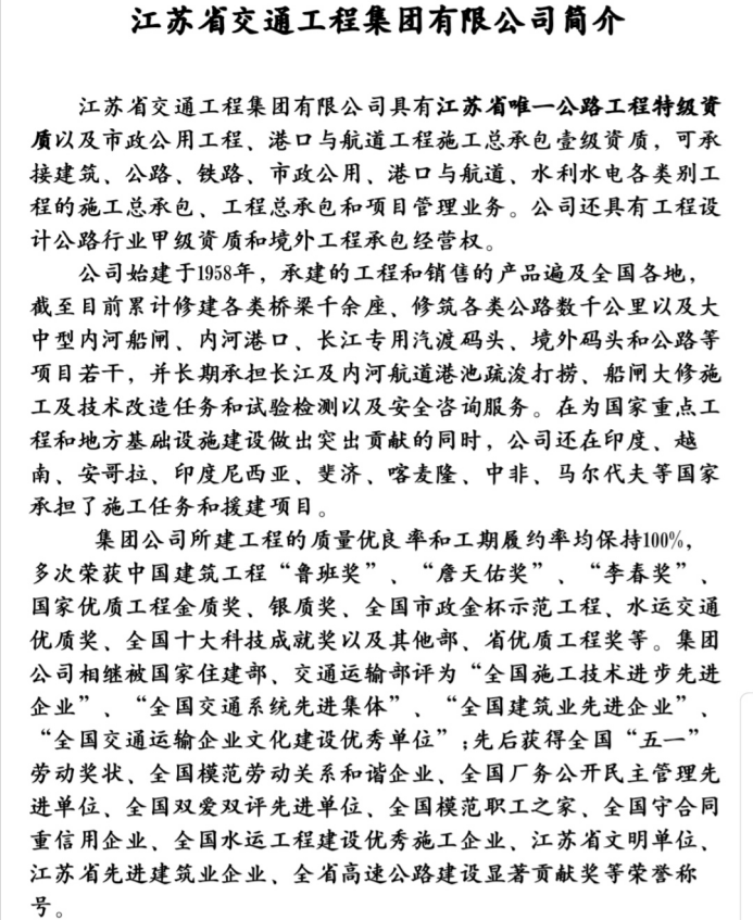 江苏省交通工程集团有限公司是江苏省唯一具有江苏省公路工程特级资质的公司。同时,该公司有着漫长的发展史,自1958年创建以来,该公司始终以质与量为生命线,严格把控质量关,至今保持所建工程质量优良率和工期履约率均