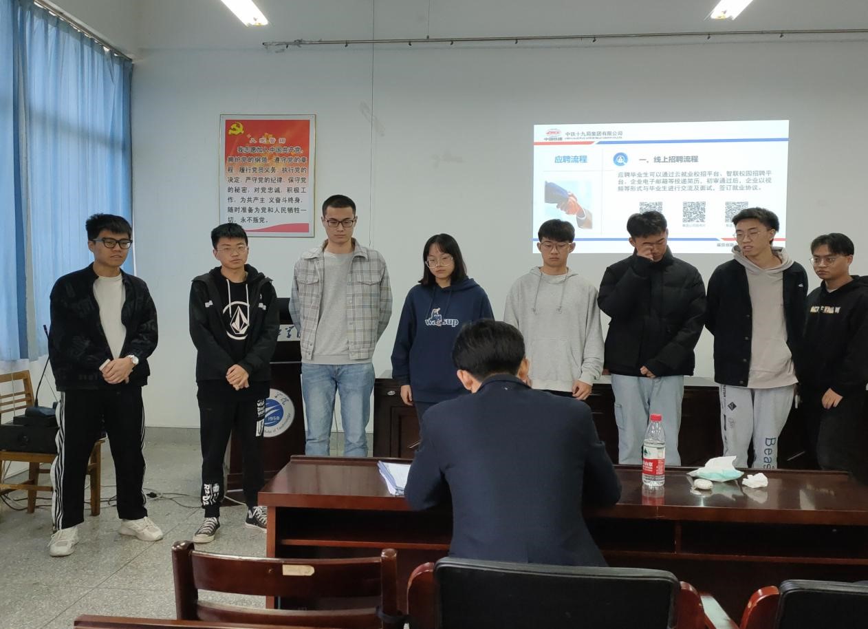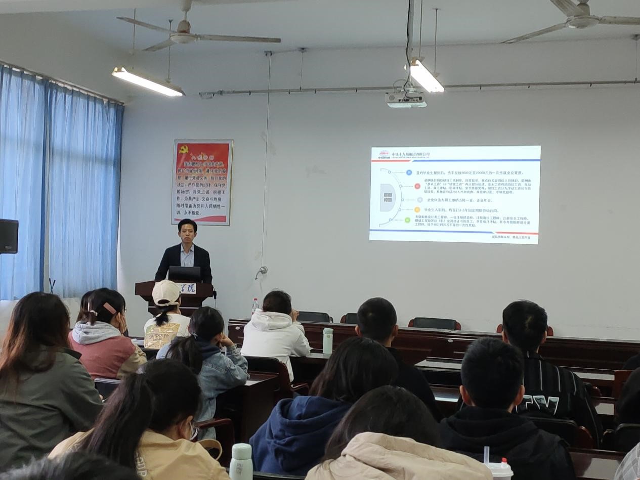 首先,中铁十九局集团第六工程有限公司团委书记兼党委组织部(人力资源部)教育培训中心主任杨书记通过一段宣传视频让同学们对中铁十九局有了初步的了解,随后再通过PPT的讲解对中铁十九局进行详细介绍,中铁十九局集团有限公司是国家铁路综合工程大型一级施工企业,是一支集铁路、公路、市政、桥梁、隧道、深基础、工业与民用建筑、水利水电、机场、港口码头、矿山、建筑与机械设备安装、土石方工程施工于一体的大型综合施工企业。不少同学都对中铁十九局表现出极大的兴趣。会议结束后,很多同学都向负责人投递了简历,并进行了面试。最后负责人会根据面试以及简历综合评价,进行第二轮面试,择优确定拟录用人选。