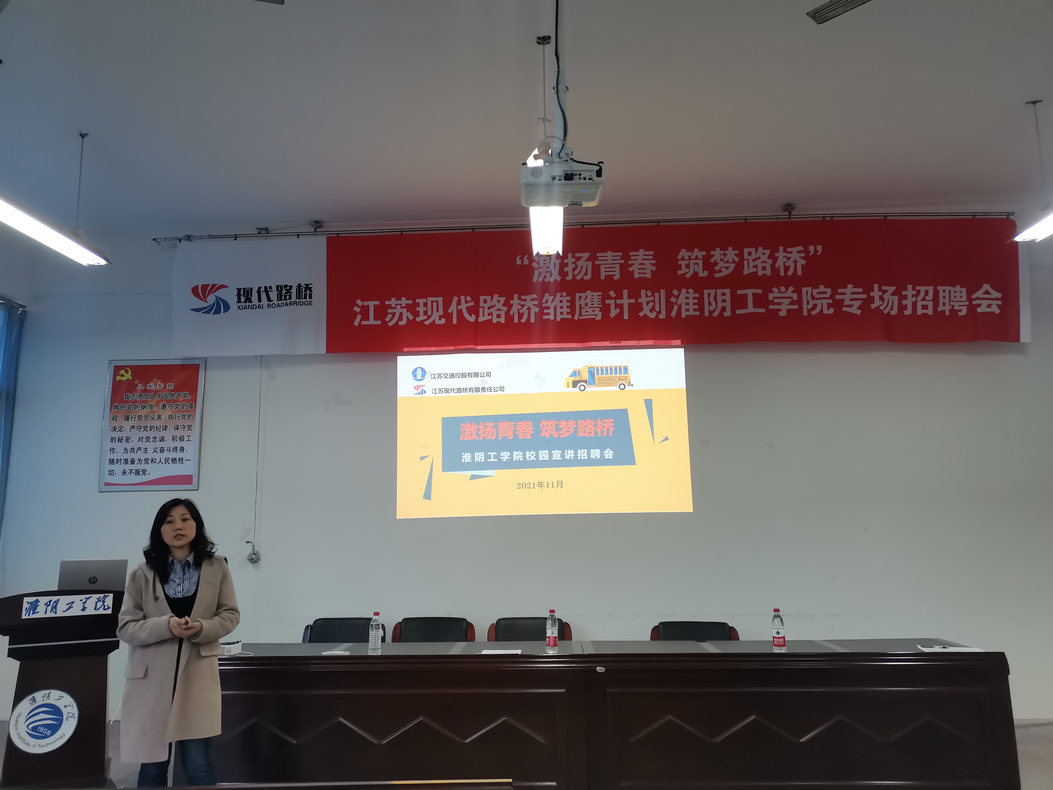 首先,公司负责人播放了一段视频,让员工们对于江苏现代路桥责任有限公司有了初步的了解,江苏现代路桥有限责任公司隶属于江苏交通控股有限公司,是一家国有专业化养护工程企业,主营路面大中修、桥梁加固维修、试验检测、日常养护、房建装饰、园林景观、养护设计等7大业务。然后,由公司两名负责人分别介绍了公司的待遇问题和工作方针等情况,“实干成就梦想,奋斗创造幸福”就是他们走向繁荣的口号。最后,感兴趣的毕业生和公司负责人进行了交流,并向公司负责人递交了自己的简历。
