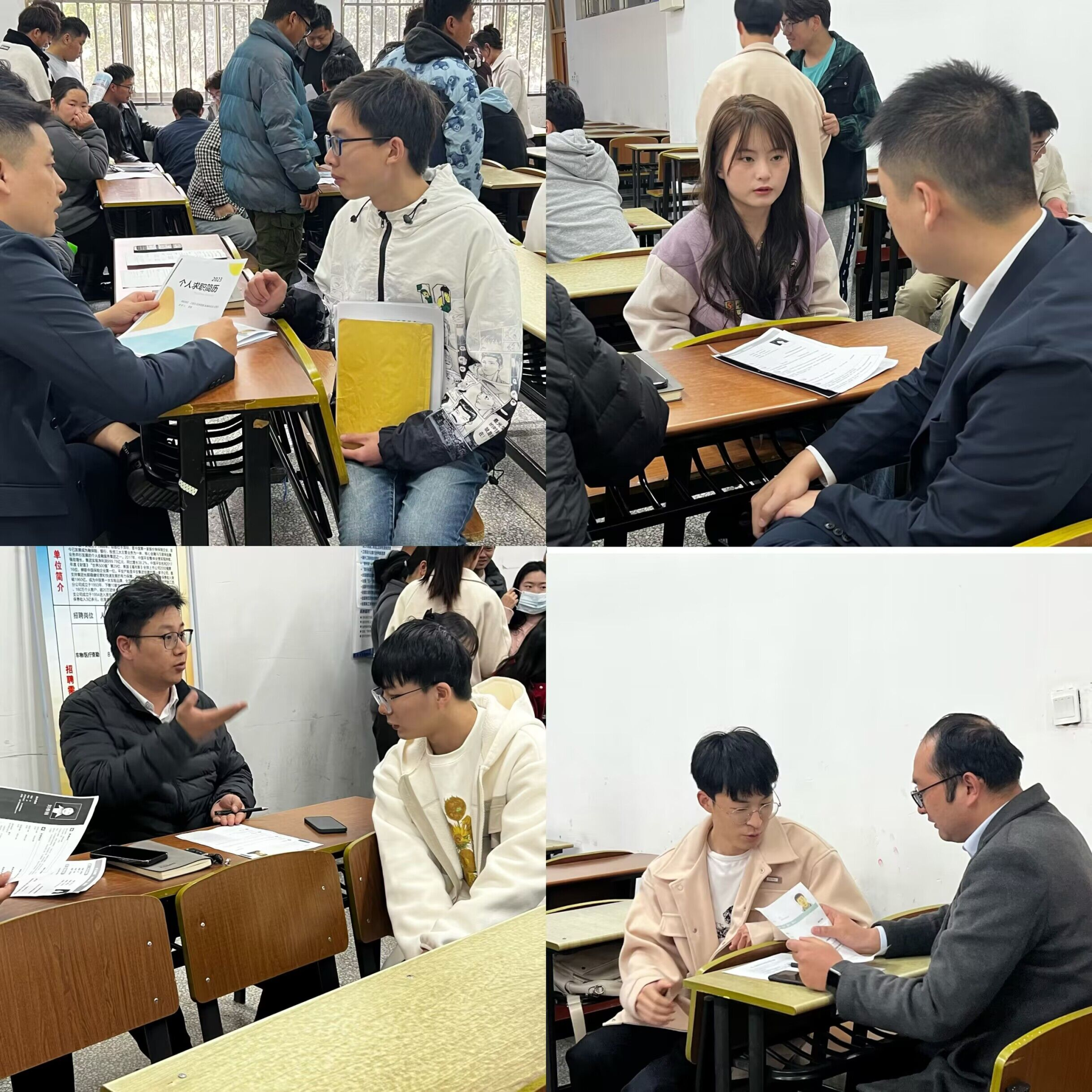 招聘会上,两个公司负责人首先简单地介绍了自己的公司情况,接着公司负责人鼓励毕业生积极提问有关公司的一些细节,并耐心的一一进行深入讲解。然后毕业生积极与各公司负责人沟通交谈,向公司负责人介绍自己,展示自己的实力与价值,互相了解情况。