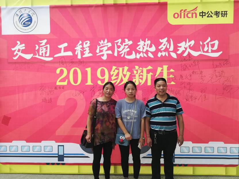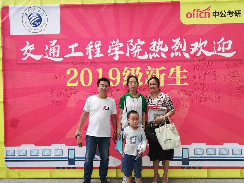 2019级新生在签名板前与家长合照留念,记录美好时刻