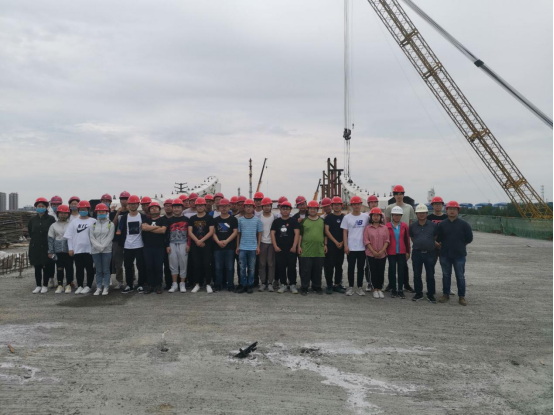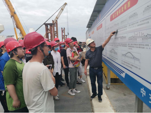 现场技术总监邓总为同学们热情讲解了西安路运河大桥钢构拼装概况与工序,其中西安路京杭运河大桥的桥梁上部结构已基本完工,在进行最后的拱肋支架拼接,同时,淮安快速路一期工程路面面层采用“6+4”的摊铺顺序,6cm厚的下面层目前基本摊铺完毕。