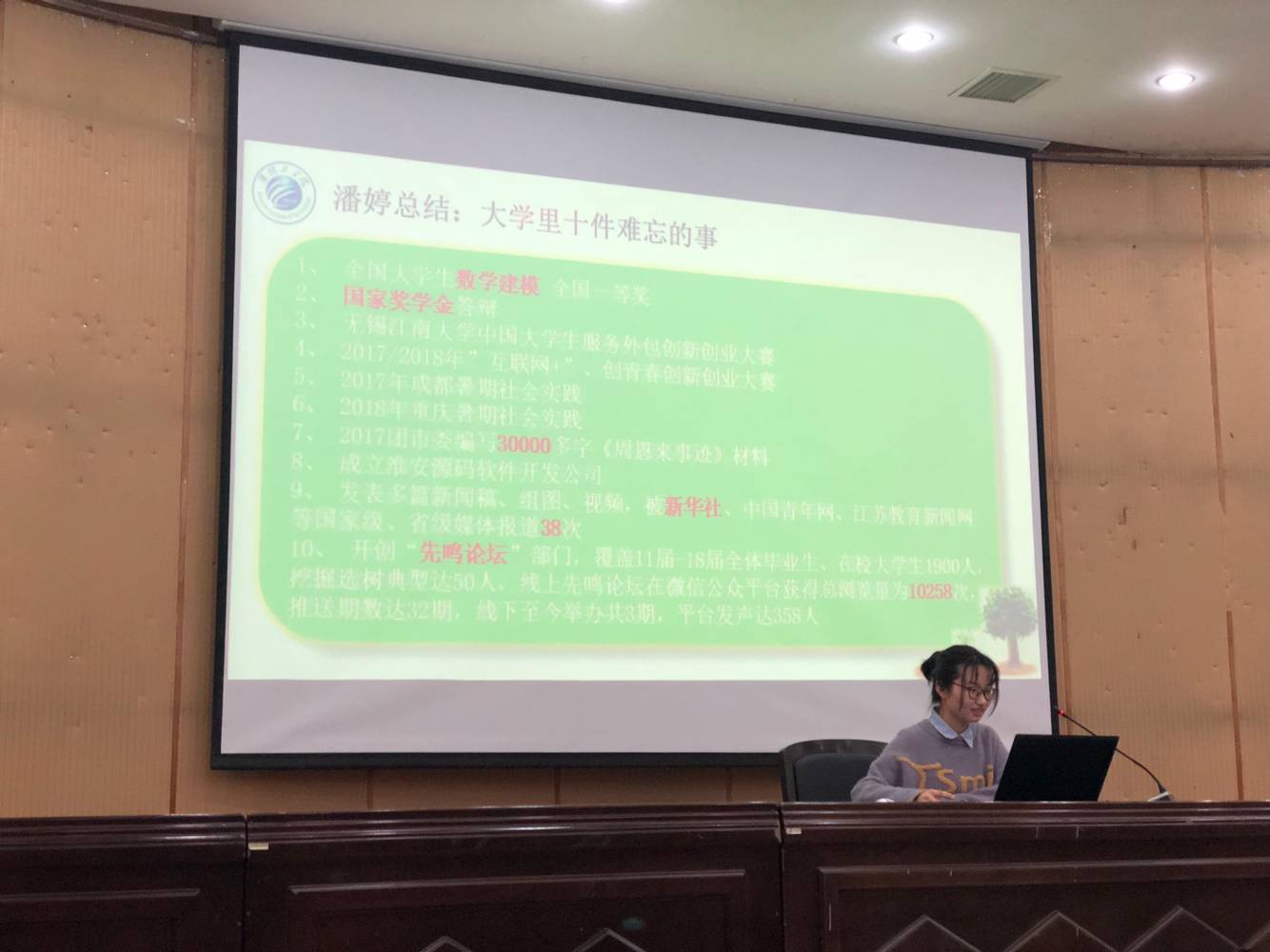 来自计算机软件工程公司的的潘婷,她以“在最美好的年华做最好的自己”为主题,希望同学们珍惜大学时光,努力提升自己的能力。在和同学们的互动中,现场气氛活跃,同学们也在这个过程中收获了许多。