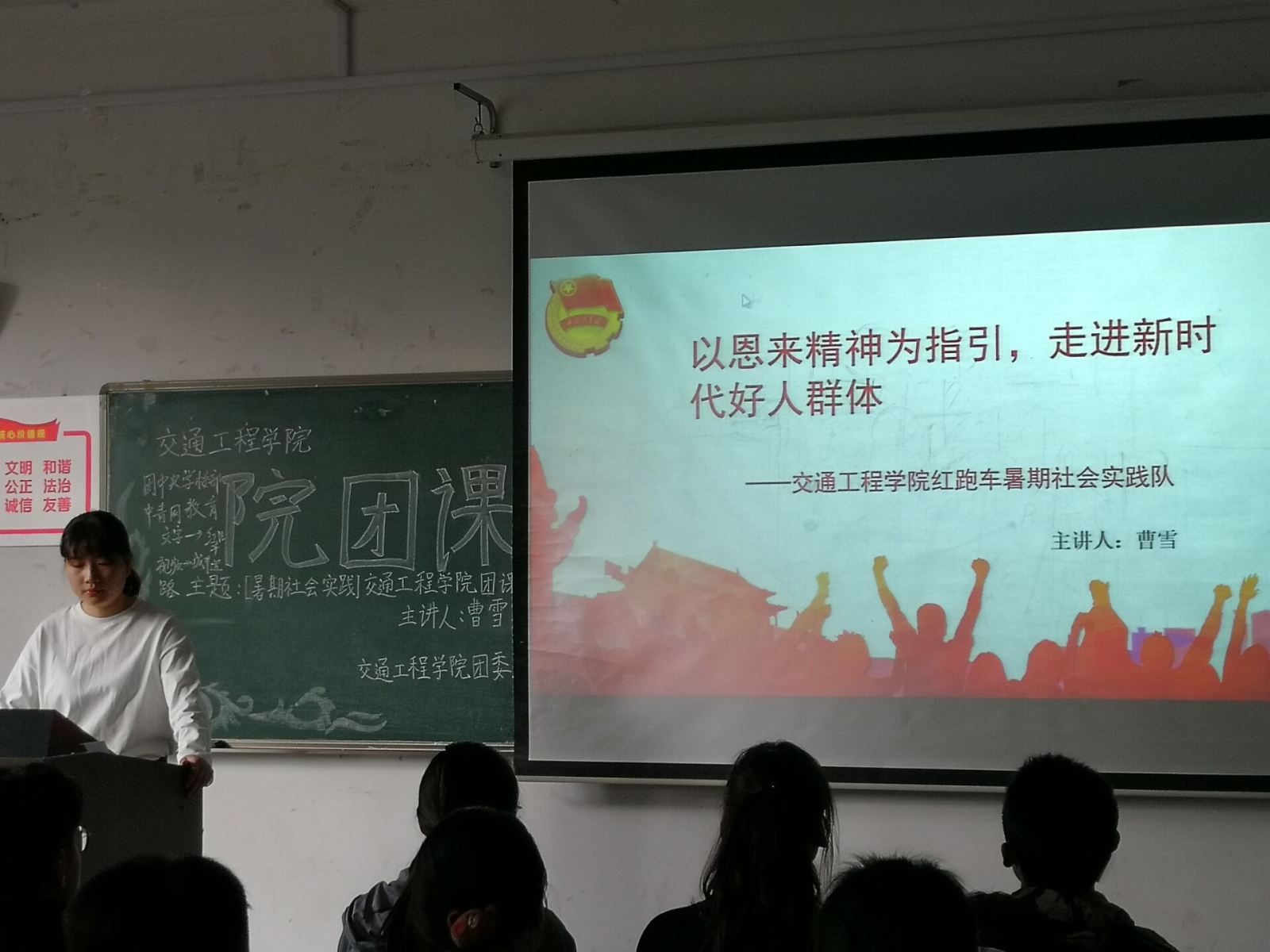 团课开始,曹雪同学以“参加暑期社会活动来获得创新创业学分”引出本次团课主题:行善举、做实事,不断为淮安精神文明建设添砖加瓦。并对党的十九大展开详细阐述。