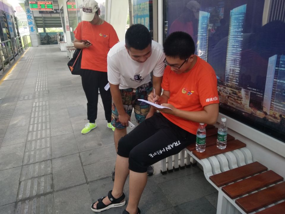 调查小队开始在有轨电车站台,对有轨电车进行了详细的数据统计,包括有轨电车减速进站时间、静止停靠时间、加速离站时间以及每个站点上下客人数。小队队员分工明确,各司其职,用平日所学专业知识,结合数据及时发现站点运行时所存在的问题并提出优化方案。此时淮安正值高温天气,小队队员们身上的衣服早已被汗水湿透,但是队员们仍然一丝不苟,紧紧盯住即将进站的有轨电车,记录下数据的空隙及时整理,利用好每一分每一秒。