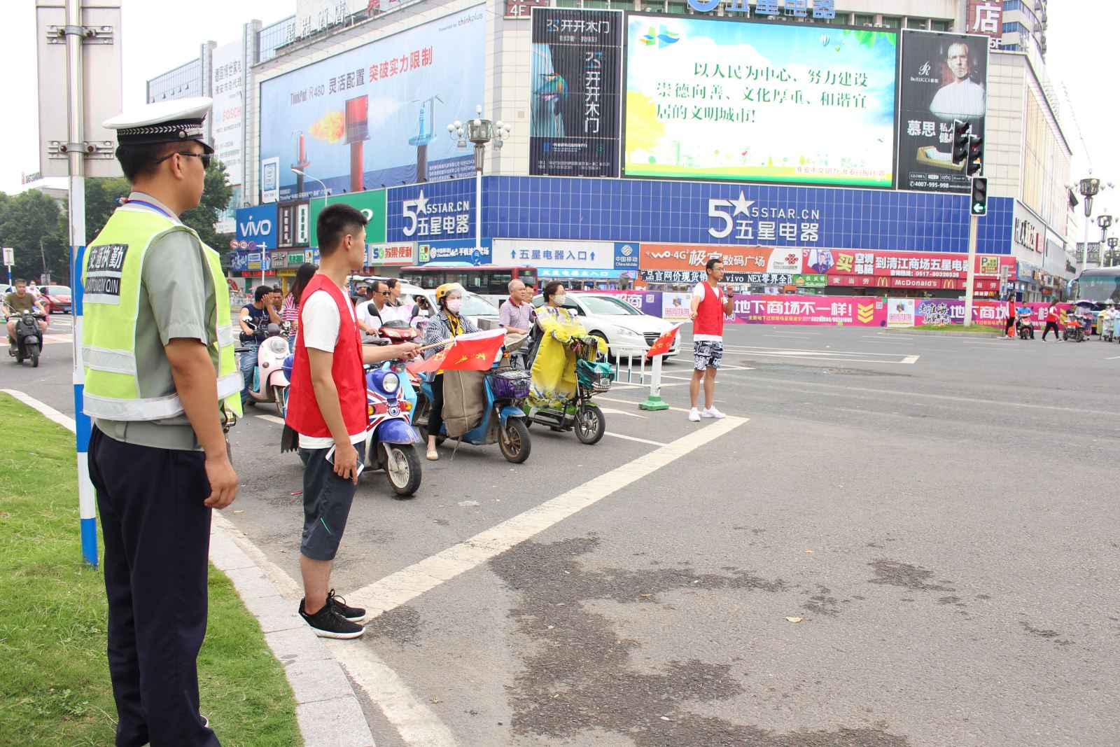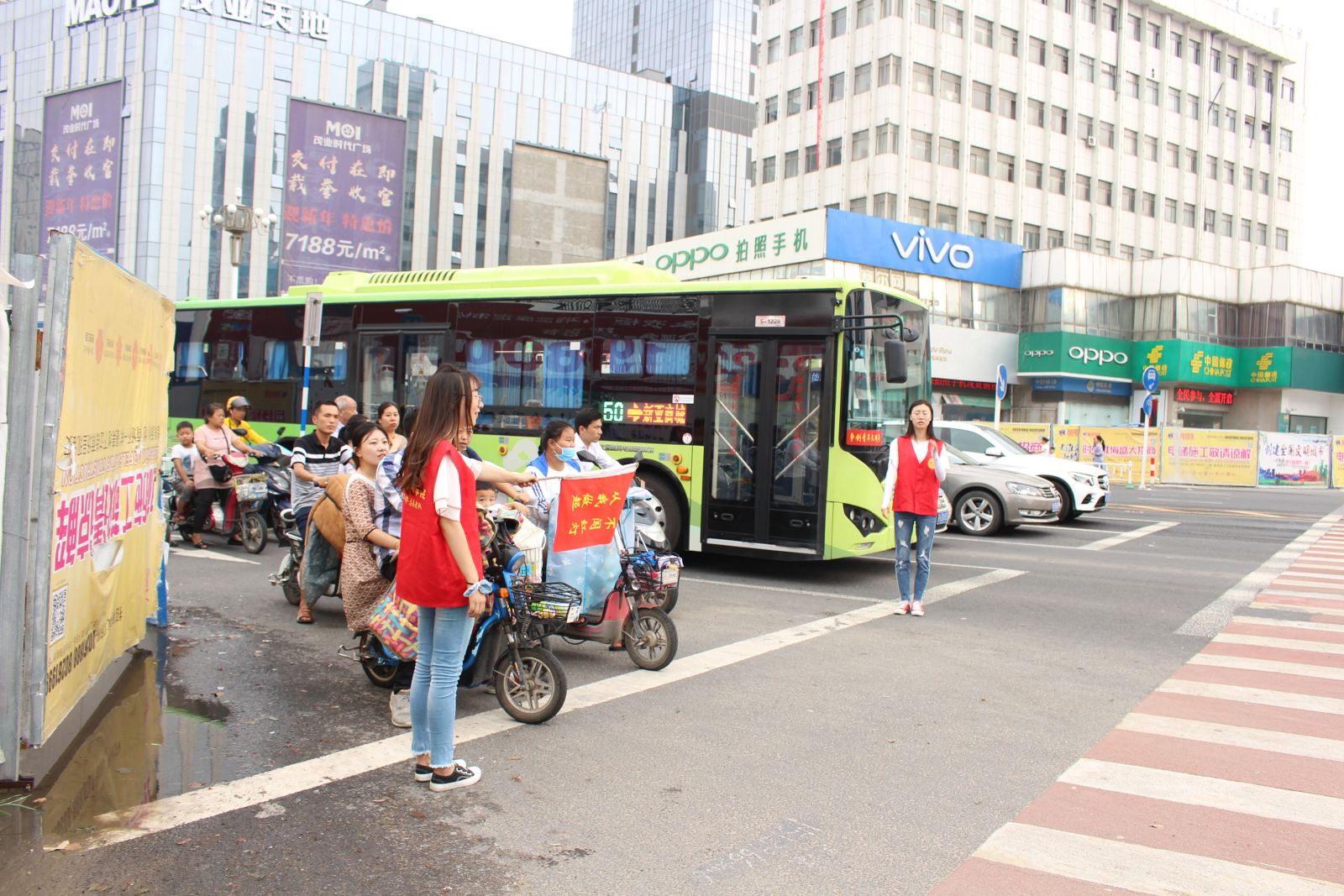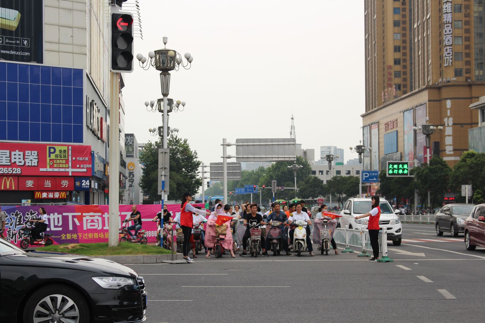 7月25日,为更深入的了解城市道路交通运行情况,提出解决承德南路和正大路交叉路口交通现状的优化方案。调查小队选择在晚高峰时协助交警指挥淮海西路和淮海北路的交叉路口的交通。该交叉路口位于市中心,在晚高峰时车流量很大,交通情况比较复杂。小队成员两两一组用红旗指挥交通,确保非机动车和行人按规则有序行驶。从实践中,队员们仔细地观察实际的交通情况,从中总结得到针对性更强的优化方案。同时借鉴了淮海西路和淮安北路交叉路口的行道布局,提出针对承德南路和正大路交叉路口的交通优化方案