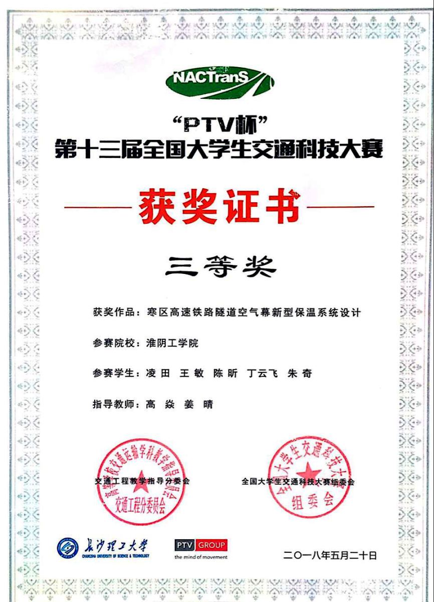 5月20日,在“PTV杯”第十三届全国老员工交通科技大赛中,公司学子运输1151凌田、运输1152王敏、陈昕、道桥1151朱奇、道桥1161丁云飞,在高焱、姜晴老师指导下完成的“寒区高速铁路隧道空气幕新型保温系统设计”荣获三等奖。