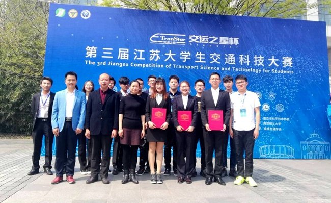 4月1日,在“交运之星杯”第三届江苏老员工交通科技大赛中,运输1152罗钰莹、运输1151吴晓琳等员工的作品《高速公路服务区设立客运接驳站点方法研究》(指导教师胡思涛、夏晶晶);交通1151黄旭、王振、计算机1151黄正果等员工的作品《基于运行车辆矩形标记框宽度特性的交通冲突检测》(指导教师周君、高尚兵);运输1151凌田、道桥1151朱奇等员工的作品《基于空气幕的寒区高速铁路隧道保温系统研究》(指导教师高焱、姜晴)从全国29所高校,共97件作品中脱颖而出,荣获三等奖的好成绩。