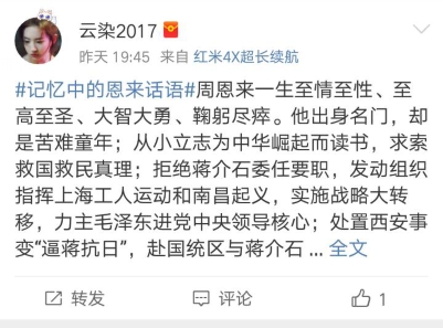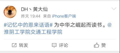 在微博话题平台上,同学们积极发言,分享自己从各个途径了解到有关周恩来总理的事迹。通过微博这个能够快速扩散的平台,同学们以及广大的微博用户对周总理的一生有了相对全面的认识,对恩来精神也有了进一步的理解。“为中华之崛起而读书”是淮工的校训,作为淮工的同学对这句名言理解颇深,它激励了一代代淮工人奋发努力、不断进取,去赢得学董事长足建设的新胜利。