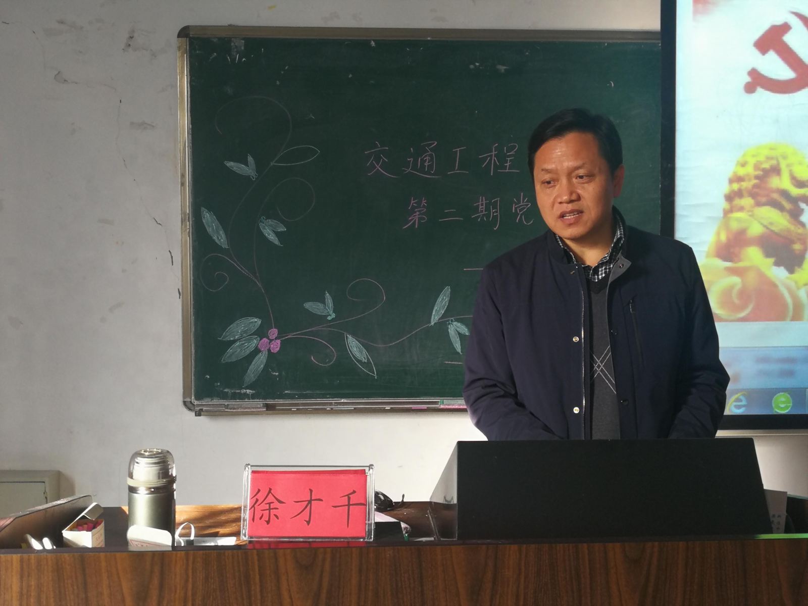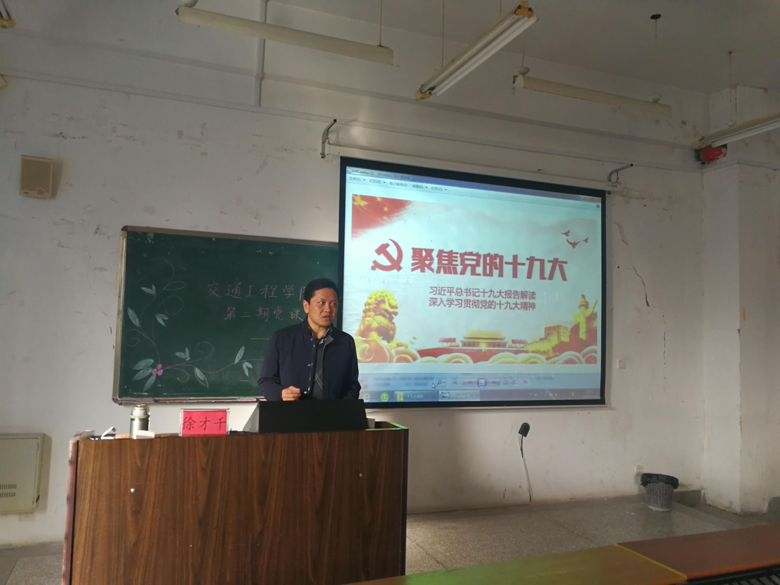 课上,徐才千书记分别从“党的十九大及重要意义”、“从十八届一中全会到其中全会重要问题”、“习近平总书记报告内容”、“做合格党员,不忘初心,永远跟党走”这四个方面进行讲解。首先,指出中国共产党的初心和使命是为中国人民谋幸福,为中华民族谋复兴。其次,明确阐述了新时代下中国所取得的历史性成就和未来几十年的发展目标。最后,倡导大家要做一名合格的党员,坚定理想信念,牢记历史使命。