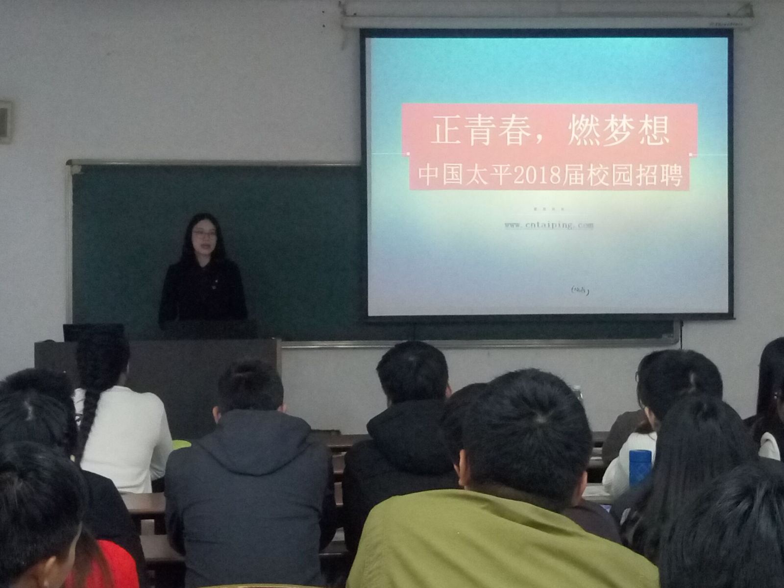 会议伊始,主讲人给同学们播放了简短的视频,介绍了中国太平的概况,让员工们有了初步的了解。之后又通过PPT给同学们展示了“正青春,燃梦想。”的主题思想,让同学们大胆的去争取自己的梦想,同时也概述了本公司的发展历程,文化底蕴,人事安排布局,以及福利待遇。主讲人讲的热情洋溢,同学们都听的很认真,也认真思考了自己将要面临的选择。之后进入到简单的笔试当中,至此,会议也就临近结束了。