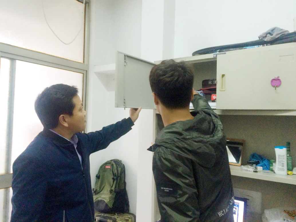徐书记和辅导员们对各年级部分员工宿舍进行了检查,对可能存在的安全隐患逐一排查,并提出了整改要求。明确要求不使用违章电器,电脑收进抽屉,不在宿舍内吸烟等,增强安全防范意识,加强自律与他律,从身边点滴小事做起,自觉遵守公寓管理制度。 徐书记还指出,在开展学风重点建设月活动和迎接本科教学工作审核评估的关键时期,形成良好的学风需以温馨的宿舍环境和良好的舍风为基础,宿舍成员必须团结一致,共创积极向上、努力进取的舍风,在养成良好的生活习惯同时,明确学习目的,端正学习态度,形成良好的学习风气。
