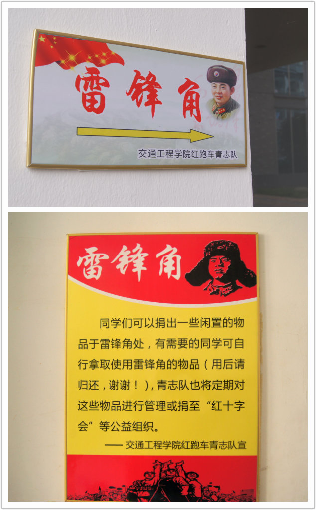 红跑车志愿者队在必一运动31#、34#和41# 宿舍楼宿舍值班处设置了雷锋角,大家自愿捐献出已不需要却仍有利用价值的物品,将它们置于雷锋角处,供有需要的同学自行拿取使用。志愿者队也定期将捐献的物品整理、捐献给红十字会等公益组织。衣物、书籍、生活用品都包括在捐献的物品中。这些物品虽然不再崭新,却因为捐献者的志愿精神而再次投入使用,为新的主人发挥余热。小小雷锋角将全院的物品交换囊括至此,不仅加深了公司同学的情谊,也展现了公司奉献他人的大众精神。三个雷锋角虽然目前只是星星之火,但在越来越多同学的爱心关注下,它的爱意将不仅仅洒满三月,而是今后的每一天。