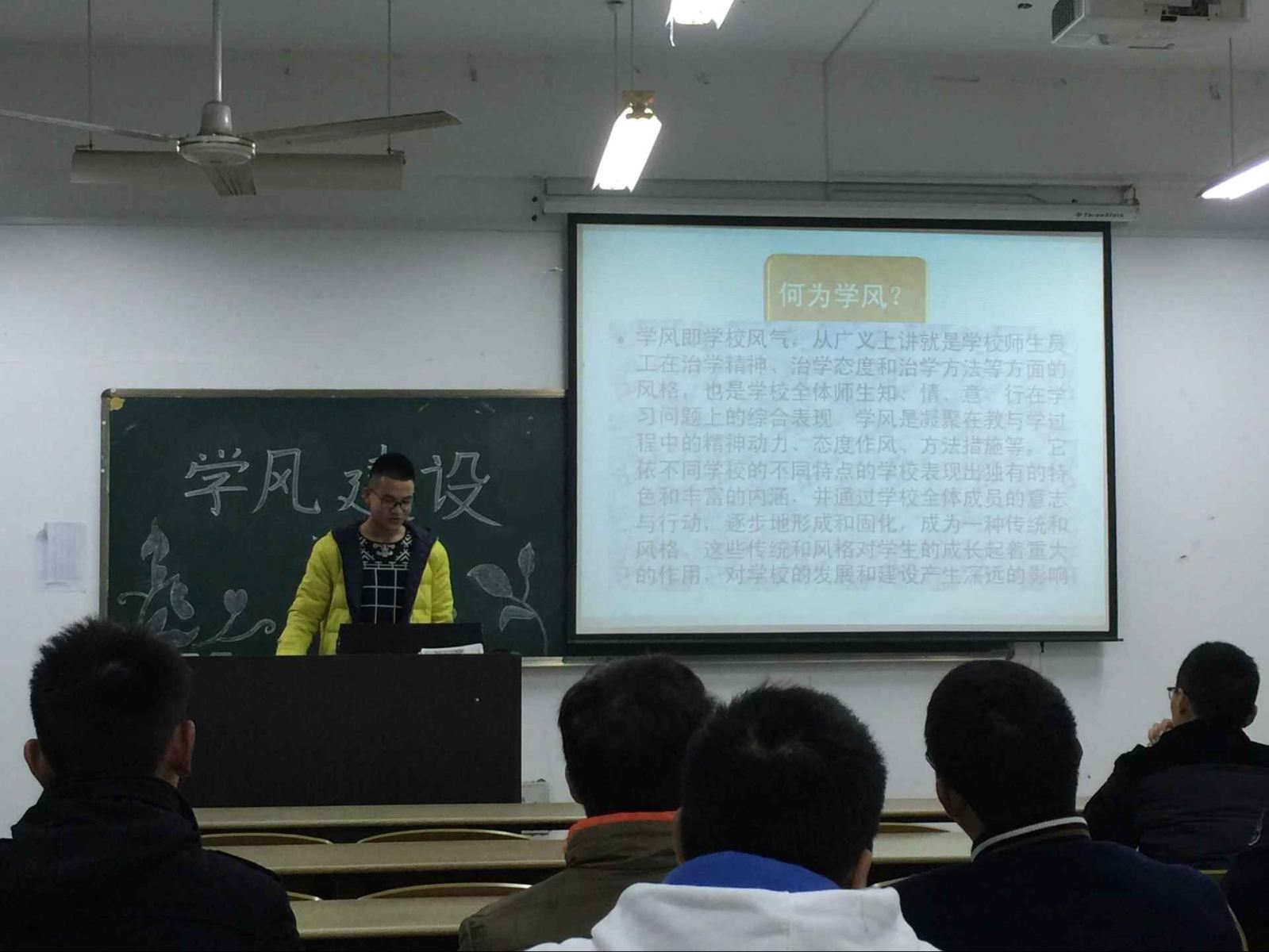 各个班级的活动都举办得很精彩,形式多种多样。有的以多媒体展示的形式向大家介绍老员工学风建设的重要性。有的组织有趣的游戏进行互动,让同学们从活动中认识到学风建设对一个班级的凝聚力有多么重要。还有的邀请了班主任为大家在学习生活中可能遇到的一些困难提出了自己的建议。最后就即将到来的英语四六级考试和期末考试向同学们进行了动员。同学们参加的积极性都很高。