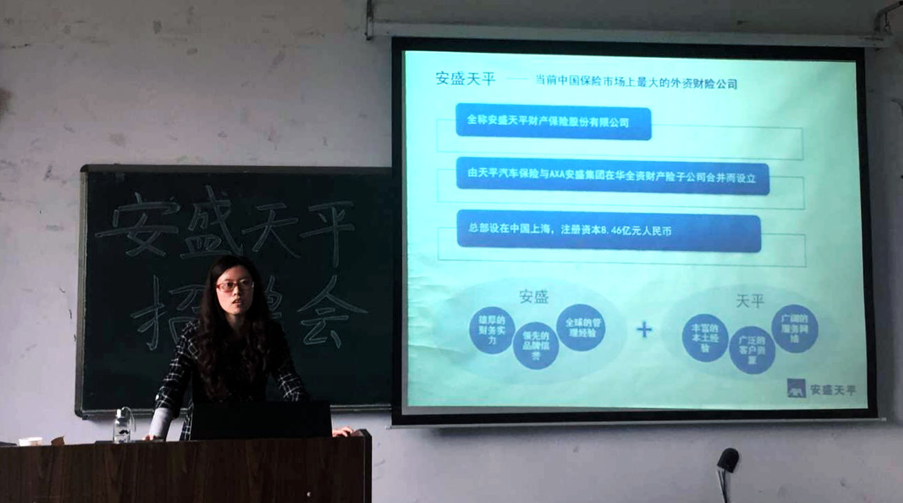 首先,主持人陈美婕通过多媒体向同学们展示了安盛集团的概况、公司的主要业务、经营理念社会主义核心价值观和机构分布。然后介绍了安盛集团在培训体系、员工假日、薪酬福利等方面上的优势,为应聘同学增加了一条有利的选择。随后,公司毕业生现为安盛天平保险工作人员的顾学长与同学们分享了自己应聘的过程和工作经历,并与同学们进行互动,解答了同学们的提问。