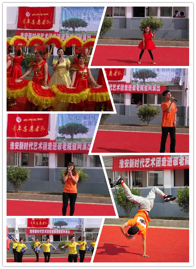 车子开了许久,路途的遥远却抵不住红跑车志愿者对老人的关切之情。一下车,志愿者立马做起了力所能及的事,如帮忙洗菜、做菜,帮老人剪指甲、理发,一个个忙得不亦乐乎,老人也都露出了幸福的笑容。吃过饭后,热热闹闹的表演就开始了。简易的舞台并没有简化主办方与协办方对老人的心意,节目丰富而又精彩。不管是歌伴舞《欢天喜地》中迷人的舞姿和动人的歌喉,还是街舞串烧丁鹏那令人惊叹的舞蹈动作,都深深地抓住了老人的心。尤其是王晨军的歌曲《时间都去哪儿了》,深情地演绎使得在场的老人纷纷为之动容。“虽然时间能带走一切,但带不走老人脸上的笑容”,志愿者真心地希望老人可以在脸上常挂笑容。