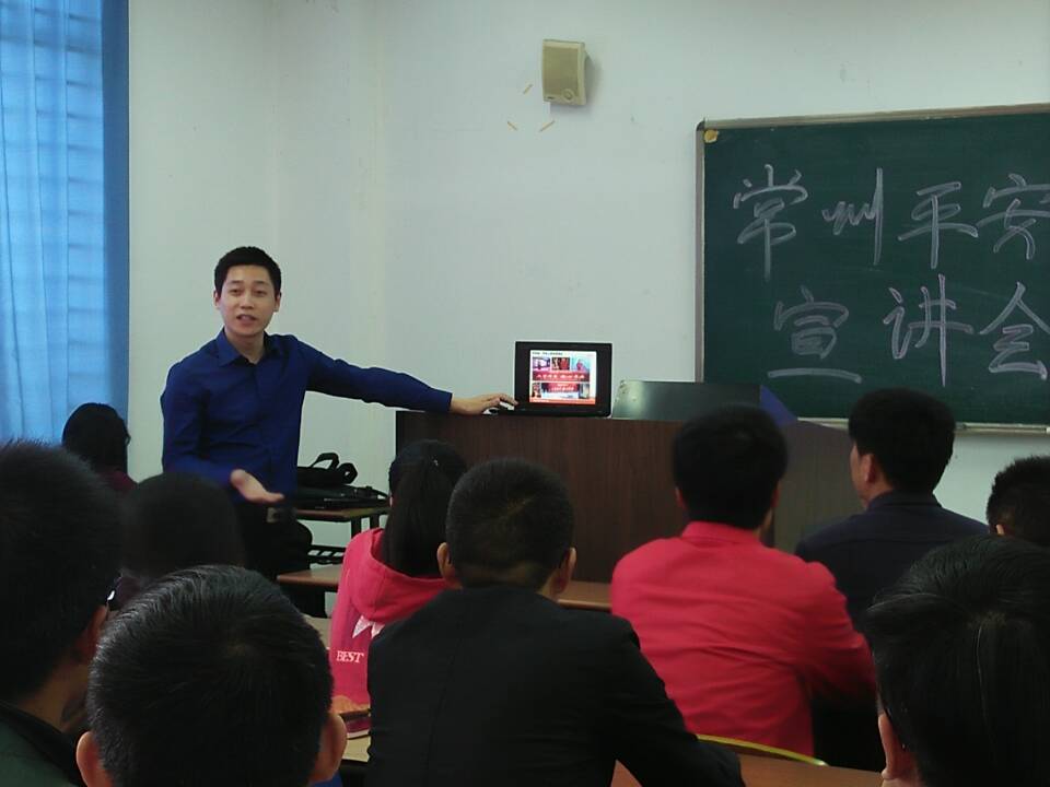 中国平安财产保险股份有限公司常州分公司客服理赔部经理陈杰用PPT形式分三个版块向前来应聘的同学详细介绍了此次招聘宣讲会的主要内容,三个版块分别是“携手平安,共赢未来”、“龙城下的平安产险”和“我骄傲,我是一名查勘定损员”。他表示,常州平安财产保险是一个团结向上的好单位,非常欢迎大家进入常州平安财产保险公司与他共事。他还耐心地回答了应聘同学提出的问题。面对同学的应聘心理,韩笑书记提醒同学要做好吃苦耐劳的准备并告诫同学凡事都要努力奋斗。