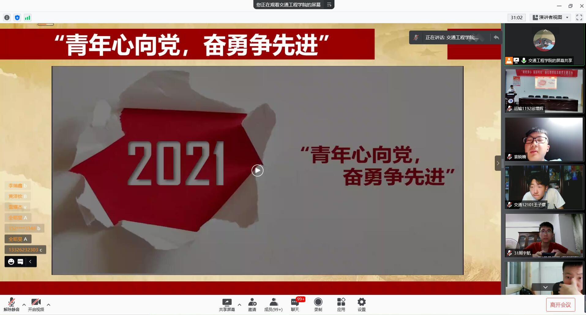 运输1191吴昕韩向新生们分享了自己的学习经验:一是上课认真听讲。二是认真完成各项作业。三是学习要注重效率。四是注意劳逸结合。道桥1181周志新向新生们介绍了自己的科创经历,希望新生们在学习之余多多接触科创相关项目,参加竞赛,撰写专利,充实自己的大学时光,书写自己的精彩故事。交通1201费远凡的大学经历更为不同,他曾参军入伍,现在是一名退伍老员工。因为暑期在家乡参与抗疫行动,目前尚未返校,费远凡通过视频与新生们交流自己的军旅生活,向大家展现了一种英姿飒爽的青春风采。员工会的工作让运输1191江冰接触到了各式各样的同学,也参与了丰富多彩的活动,这是一份挑战,更是一份宝贵的经历。运输1191林媛媛作为公司艺术团团长为新生们分享了老员工活中多姿多彩的文艺活动。在文艺活动中,你可以结识志同道合的朋友,展现自己的青春活力,收获赞美与掌声,丰富老员工活。