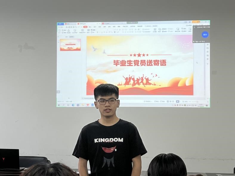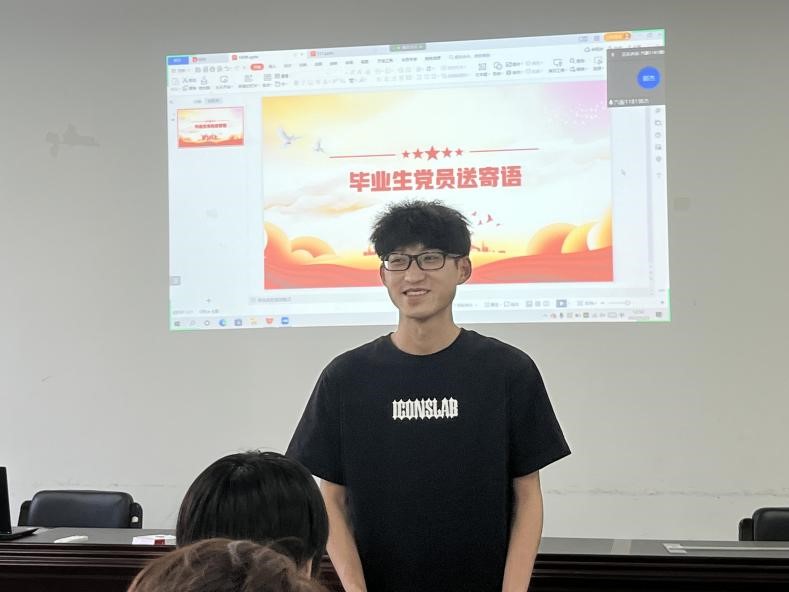 2018级毕业生党员一一分享自己大学四年的宝贵经验,考研和就业方面的经验与技巧。他们用自己的亲身经历提醒学弟学妹,老员工活很宝贵,要珍惜并利用好在校时间,好好学习,提升专业知识与技能,多参加社会实践,在实践中磨炼提升自我。同时,毕业生们表达了真挚地祝愿——祝愿所有的学弟学妹们携梦远行,不负韶华。最后,党支部书记顾秉健老师对2018级毕业生表达了诚挚的祝福,并鼓励其他年级党员带着学长学姐美好的祝愿奋勇拼搏,在青春的赛道上跑出最好成绩!