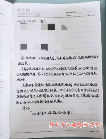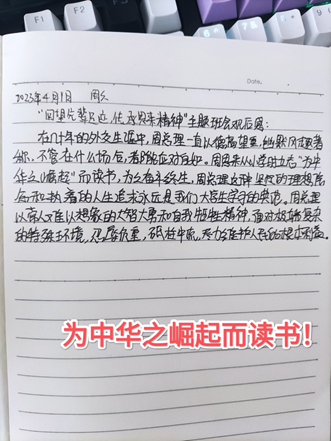 影片结束后,同学们纷纷表示要不断奋斗,砥砺前行,学习并传承恩来精神,践行初心使命,并在自己的“日日总结”日程本中写下“为中华之崛起而读书!”的观后感。