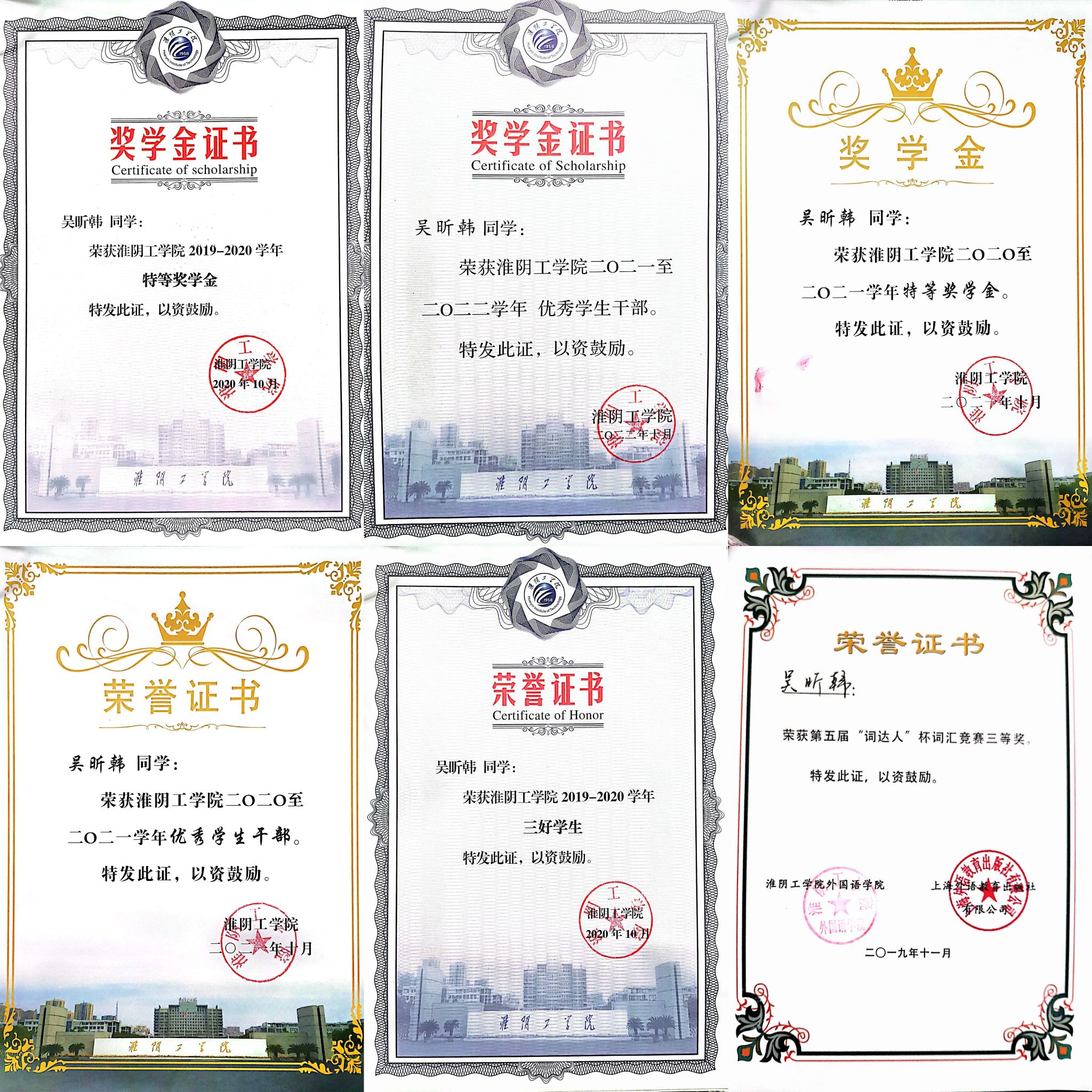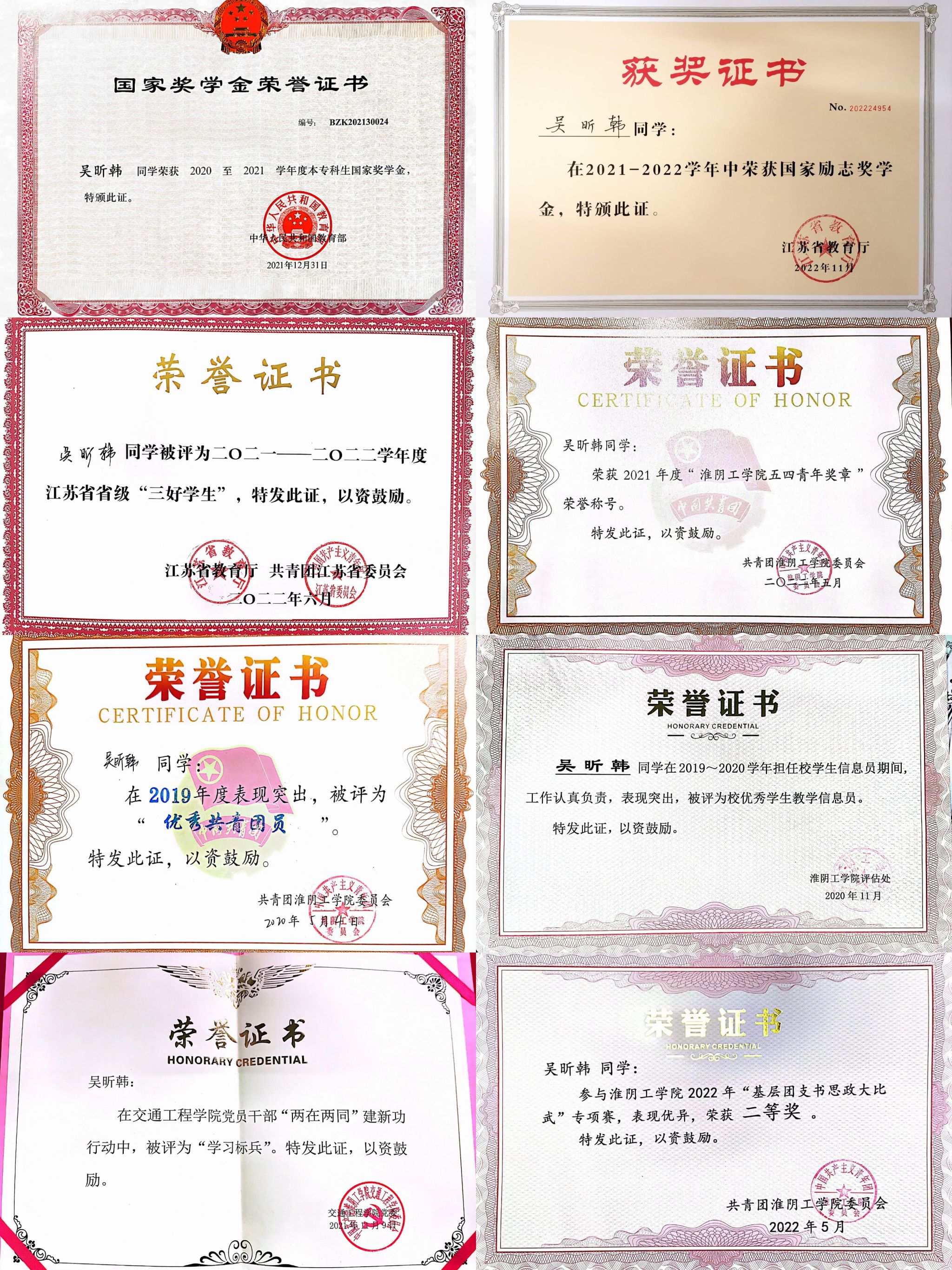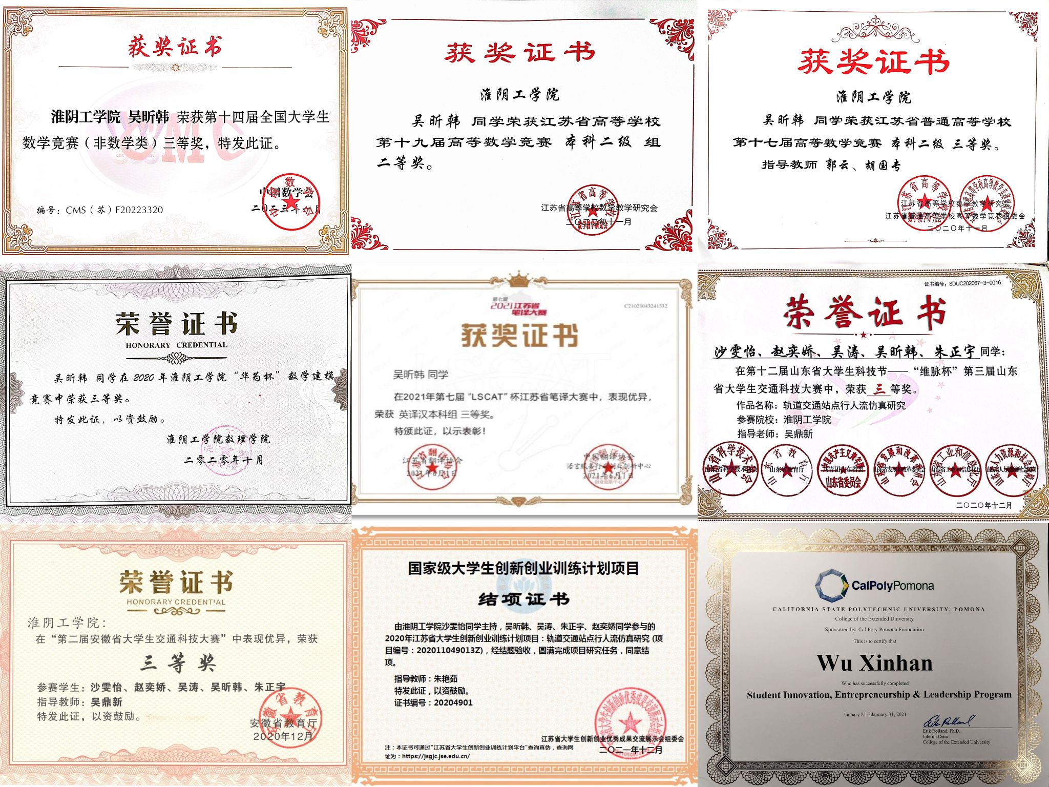 曾获国家奖学金、国家励志奖学金、江苏省三好员工、校五四青年奖章、校特等奖学金(2次)、校三好员工、校优秀员工干部(2次)。获得第十四届全国老员工数学竞赛三等奖等国家级、省市校级奖项40余项。授权发明专利1项,实用新型专利2项,受理发明专利2项。
