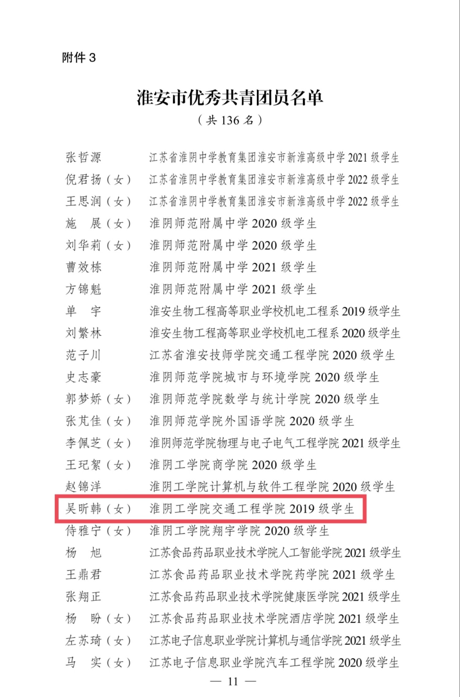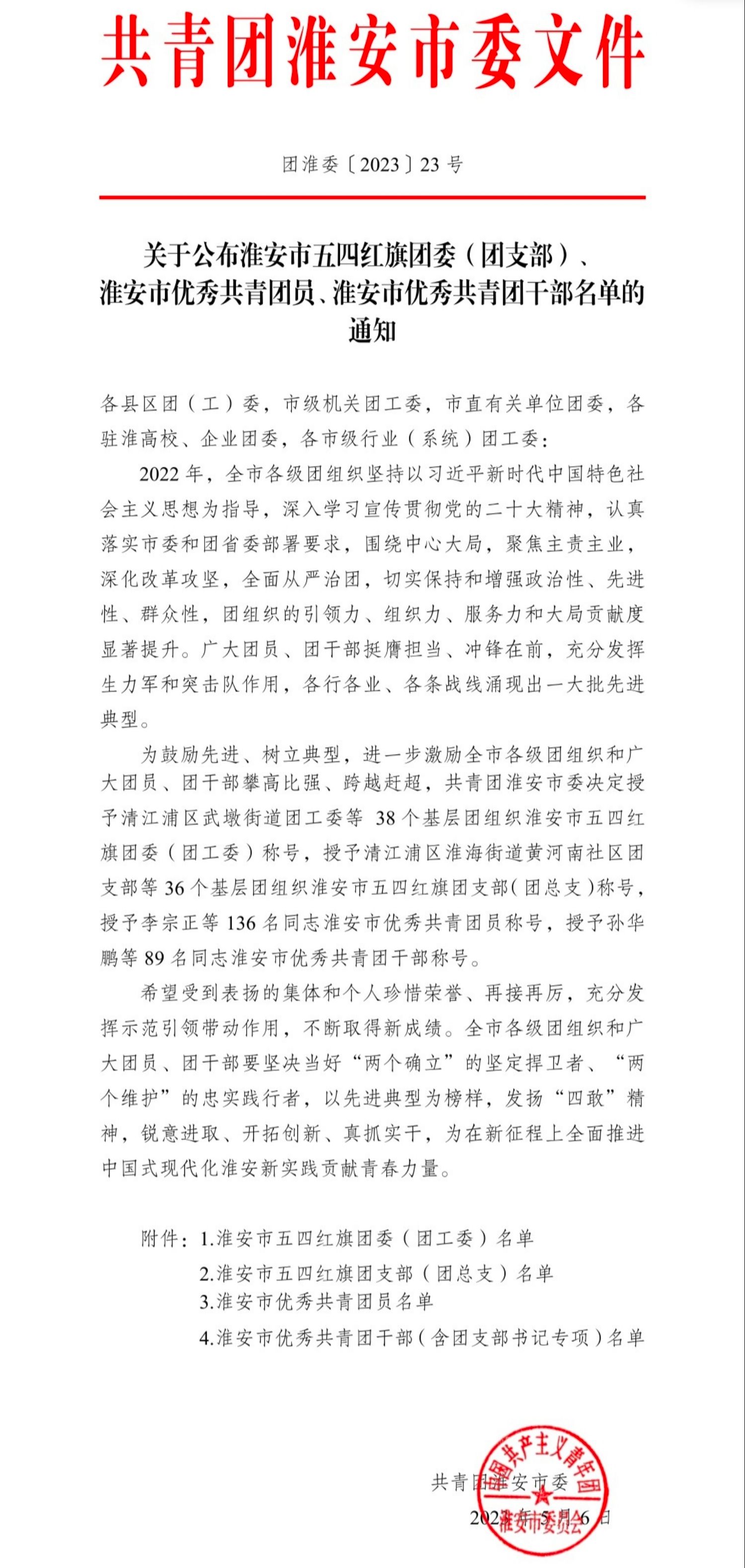 近日,由共青团淮安市委组织的淮安市五四红旗团委(团支部)、淮安市优秀共青团员、淮安市优秀共青团干部的评选结果揭晓。公司运输1191吴昕韩同学荣获淮安市“优秀共青团员”荣誉称号。