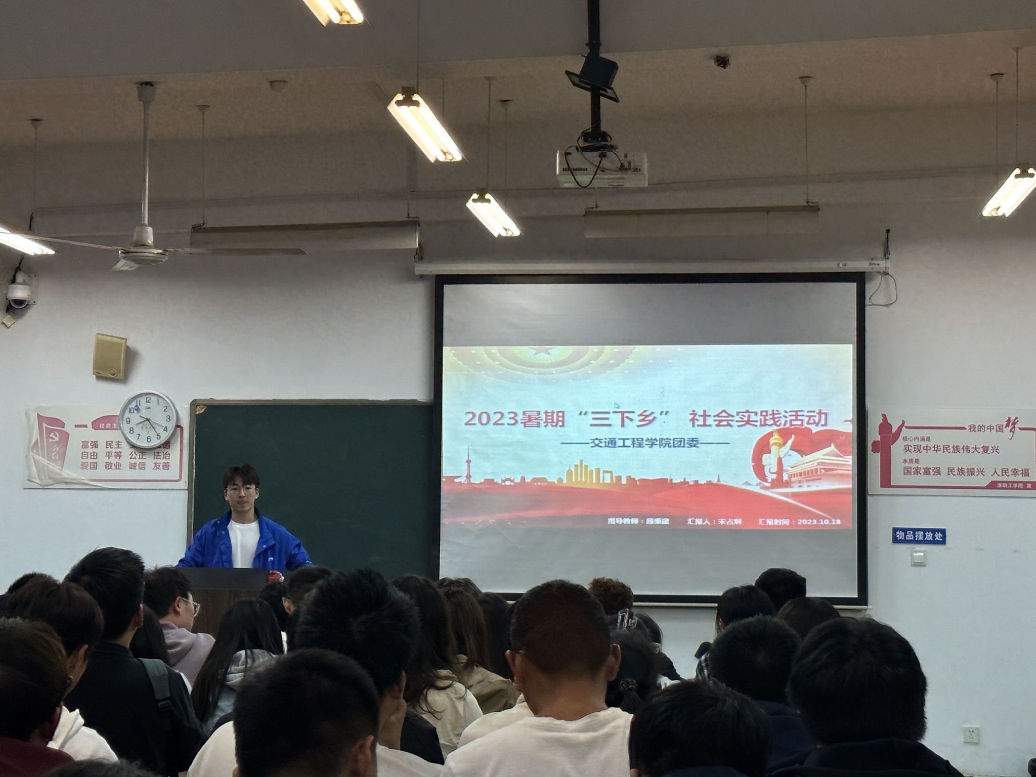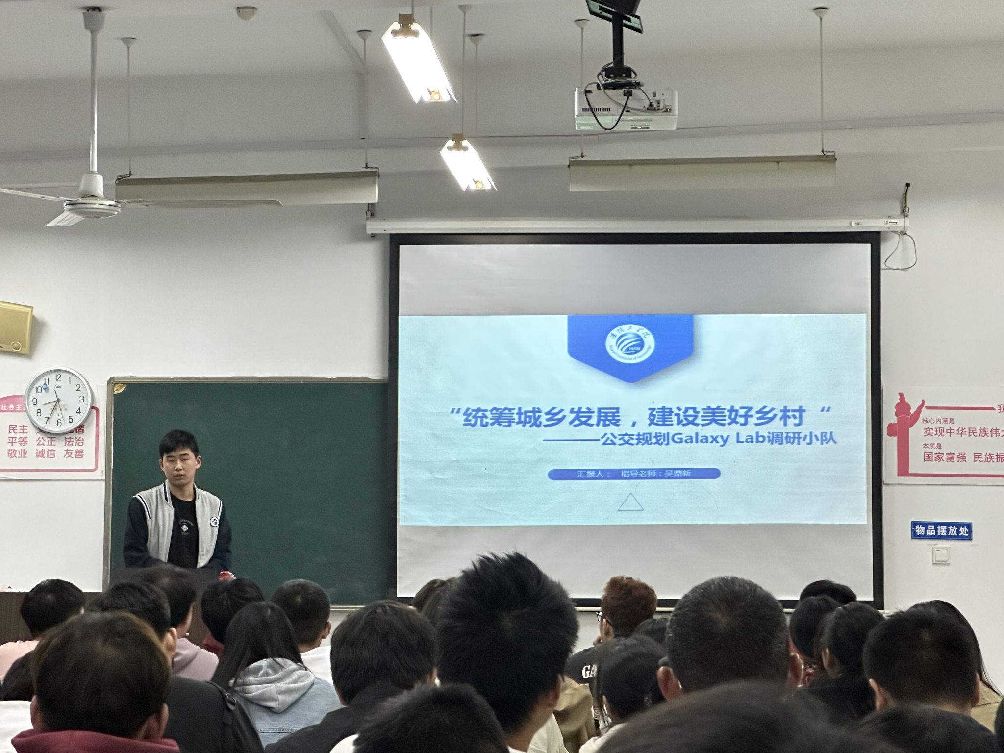 最后,沈志成同学围绕自己的优秀“三下乡”实践项目:“统筹城乡发展,建设美好乡村”,向同学们介绍了团队积极响应盱眙县运输局的号召,配合盱眙县运输局开展居民出行志愿调查等系列工作,并号召全体同学响应习总书记“绿色交通”的要求,为城乡公交一体化建设发展贡献自己的青春力量。