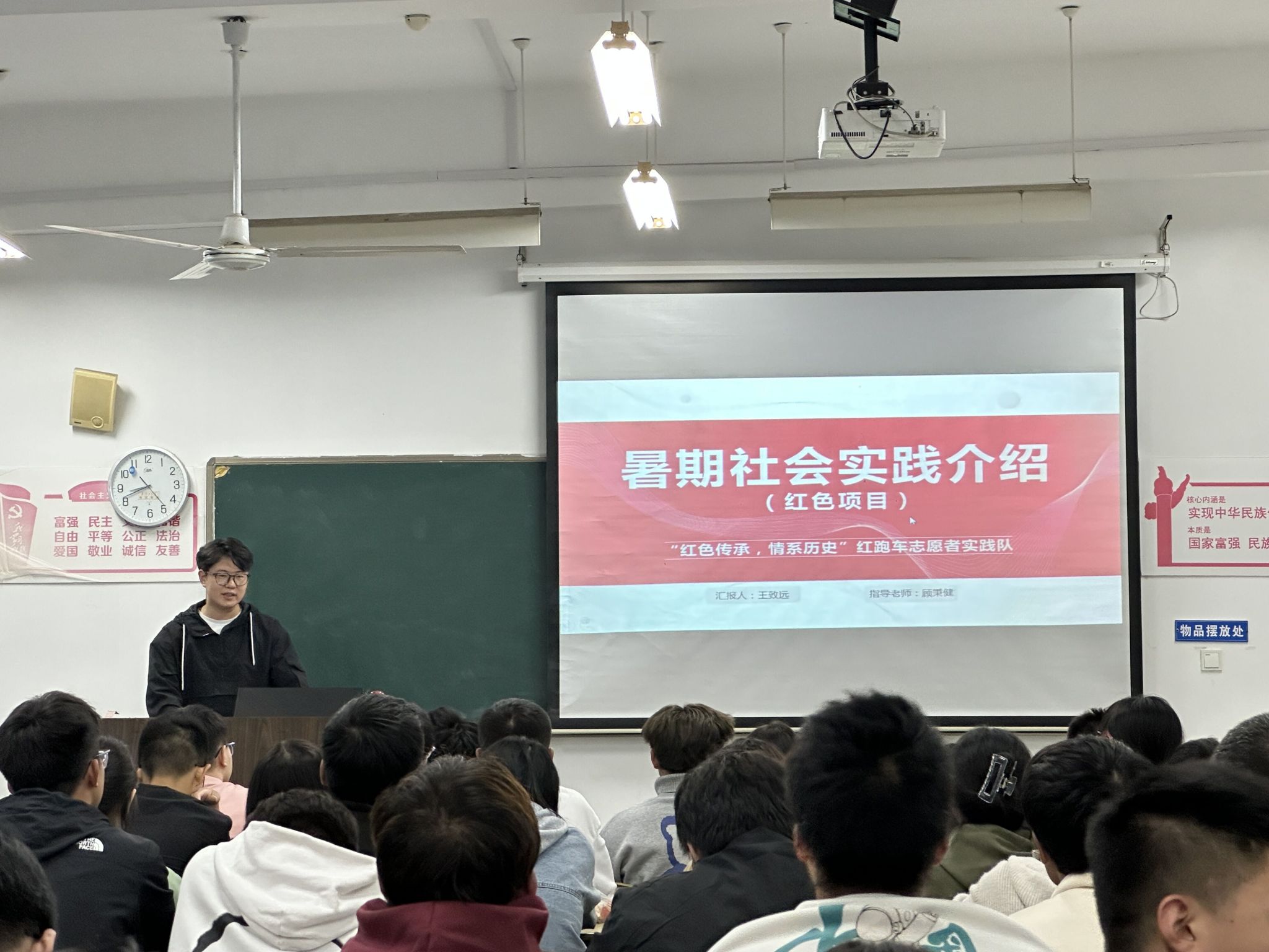 接着,王致远同学通过分享自己的优秀“三下乡”实践项目:“红色传承,情系历史”向同学们拓展延伸了公司“一院一品”志愿服务品牌,让同学们深刻的认识到了红跑车志愿者实践队的创办意义。