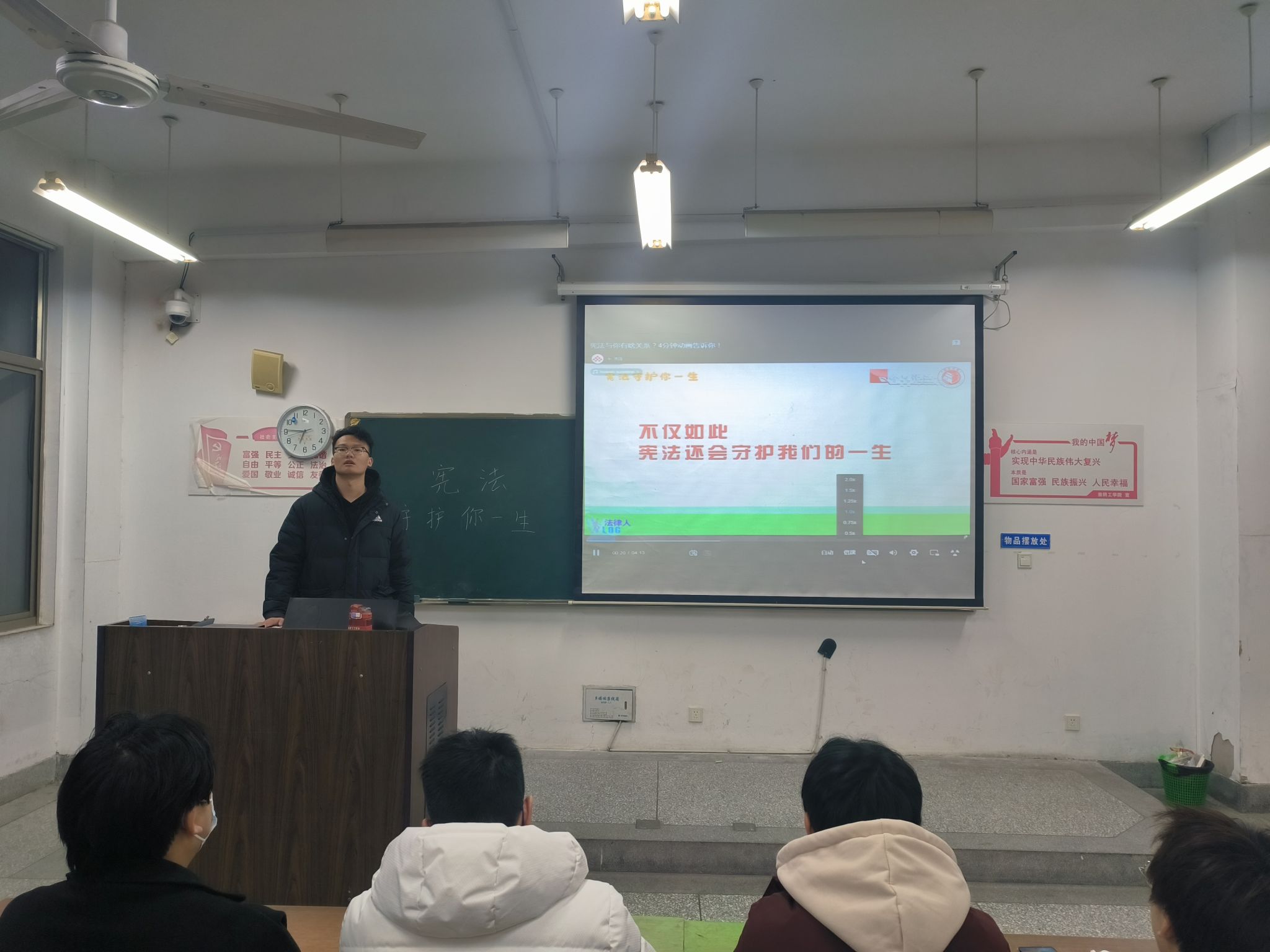 本次会议通过观看《宪法守护你一生》视频短片让同学们了解到宪法在一生中对我们的保护。视频从宪法保障公民的权利与义务、公民选举权与被选举权受宪法保障、公民的劳动权利受宪法保护等一系列角度,向同学们展现了宪法在公民一生中不同阶段的保障,加强了同学们对宪法的了解,让同学们切身体会到宪法学习在我们日常生活中的必要性和重要性。