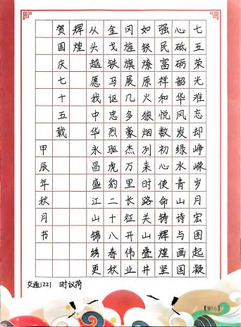 同学们通过书法的形式书写赞歌来表达对祖国母亲的赞美。同学们或用毛笔、或用钢笔,传唱古人对家国的爱恋,书写新时代青年对祖国的美好祝愿。