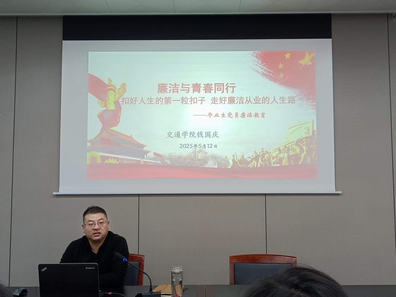 首先,钱国庆作了《廉洁与青春同行--扣好人生的第一粒扣子 走好廉洁从业的人生路》廉洁教育党课,并要求全体毕业生党员:一要坚定理想信念,不忘初心,将党性修养内化于心,外化于行;二要立德修身,强化规矩意识,筑牢廉政防火墙;三要知敬畏、存戒惧、守底线,坚持知行合一,恪守职业操守;四要勇于奋斗担当,不怕困难挫折,常怀感恩之心。