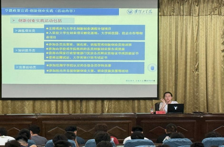 紧接着,她从学分认定标准与活动内容双维度,深度解析“创新创业实践”体系,分层讲解竞赛培训、讲座报告、职业技能证书、注册公司、社会实践与文化艺术活动等类别,明确每类活动的学分要求、审核部门及证明材料,以“修不满学分不允许毕业”的硬性要求,唤醒新生的规划意识与参与主动性。