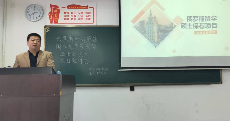 首先,宣传老师播放了在俄罗斯留学的学长、学姐录制的职工活视频,让同学们对俄罗斯的职工活有了初步的了解。播放结束后,宣传老师以PPT的形式介绍了俄罗斯硕士保荐项目。此项目从2018年开始,目前已经有近200名中国员工在俄罗斯各高校攻读硕士学位。接着,宣传老师从风土人情、生活习惯、物价情况等方面详细介绍了在俄罗斯留学的情况,让有留学打算的同学们更进一步了解了详情。最后,宣传老师从留学费用、住宿情况、专业要求、语言要求等方面详细介绍了几所可供留学的俄罗斯高校。