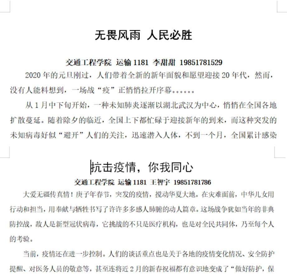 活动时长为一天,虽然时间紧、任务重,但是参与比赛的同学都按时提交了自己的作品。本次比赛的评比工作由班委担任,对每一份作品进行点评。参赛同学的作品中既梳理了中国抗疫的时间线,记录了深入人心的抗疫故事,也抒发了自己对抗疫工作者的感激和敬佩之情。同时,也有部分作品以国外疫情为切入点,而后与国内疫情做对比,鲜明衬托出中国抗疫工作的高效性和准确性。本次征文比赛不仅评选出一批优秀的作品,更突显出青年老员工对于新冠疫情深切的关注。对于疫情的发展,既做到了解于心,也拥有对于势态的独立思考,体会到党和国家在此次战役中对人民利益的重视和切实维护,这同样有助于青年老员工爱党爱国情怀的培养和抒发。