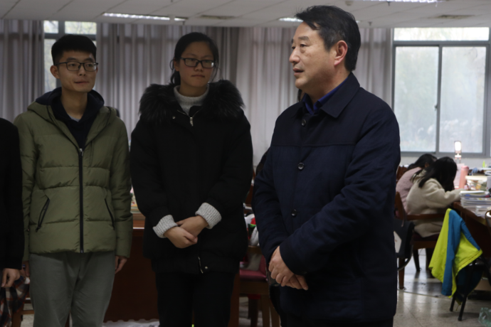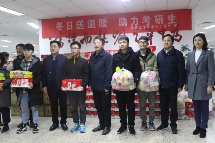 活动最后,校领导向考研学子发放面包、牛奶等慰问品,并与考研代表合影留念。
