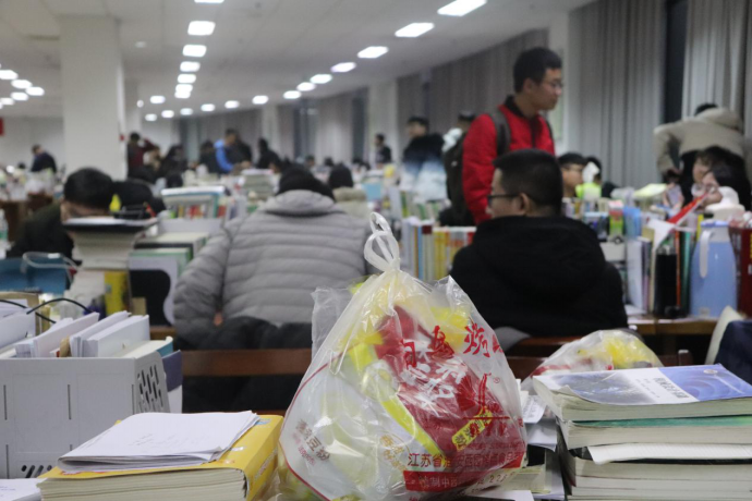 图书馆一楼考研自习教室里灯火通明,屋外的寒风并没有使考研学子畏怯,他们埋头学习,化自己的意志为奋斗之路上的明灯,用自己的努力去寻找未来的希望。