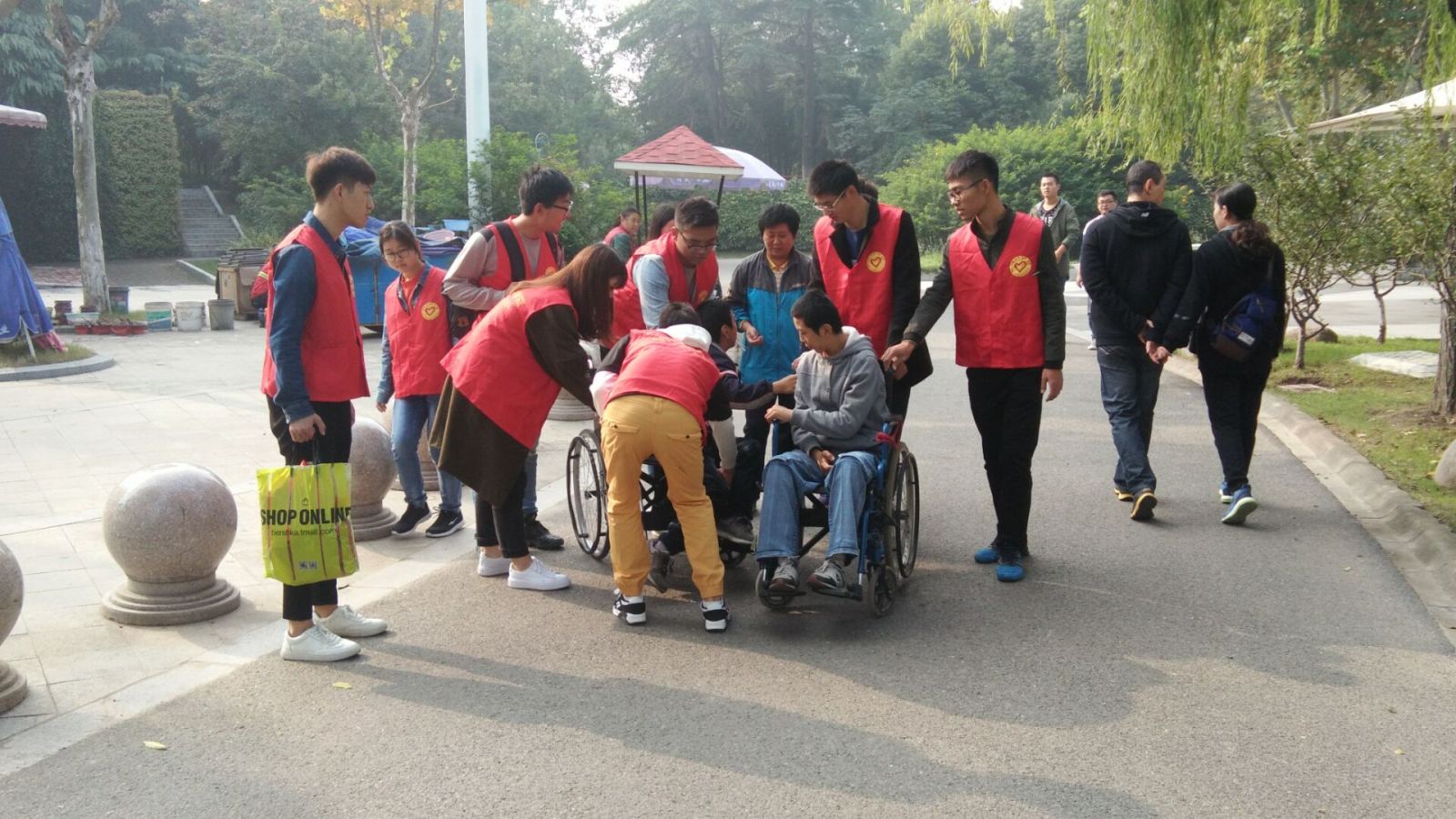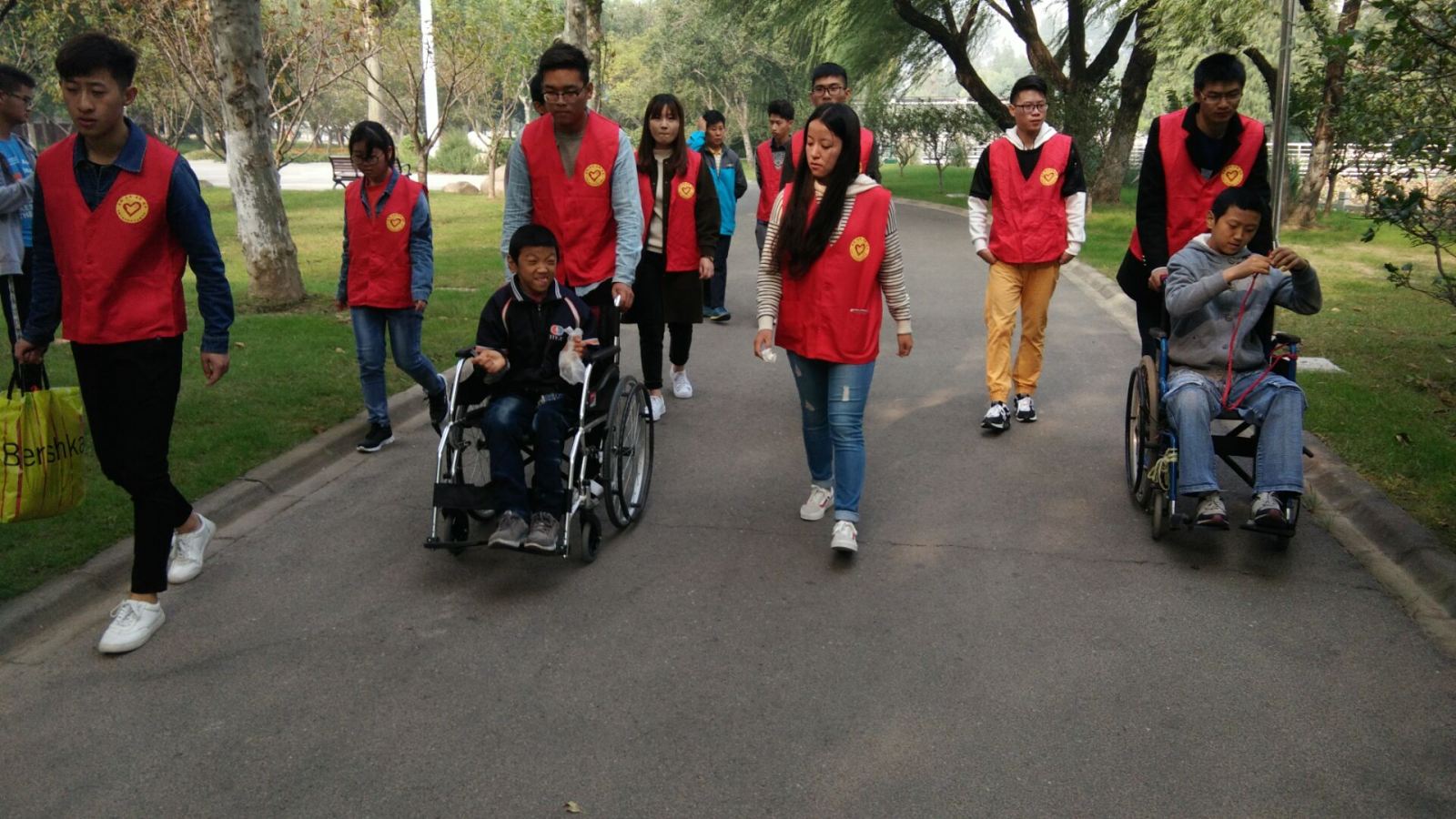 在孩子家长的陪同下,志愿者们顺利将孩子接到楚秀园。同时,志愿者们拿自己的身份证作为抵押,为行动不便的孩子租借了轮椅。在红跑车青年志愿者队的帮助下,孩子们观光了楚秀园的各个景点,到湖边,到桥上,到游乐场。从孩子们的笑脸上可以看到他们内心的温暖喜悦,从青年志愿者们微笑的表情上可以看到他们的爱心。最后,志愿者们和孩子及其家长在楚秀湖旁拍照纪念,并把孩子们安全送回了家。祝愿这两位孩子能够早日康复,健康成长。