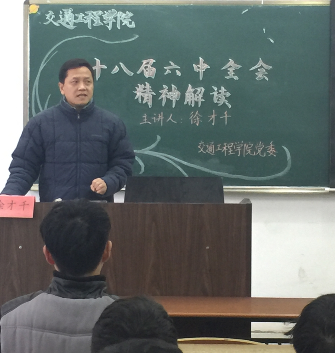 在本次党课学习中,徐才千书记生动形象地为同学们解读了十八届六中全会的精神。他指出,自十八届以来,习近平总书记已经成为了新一代的中央领导核心,他着力全面从严治党,打掉了很多个贪污腐败的高层,但这样打老虎是打不完的,要想打完老虎,就要制定并完善制度,从制度上约束和预防。另外,全会决定,中国共产党第十九次全国代表大会将于2017年下半年在北京召开。
