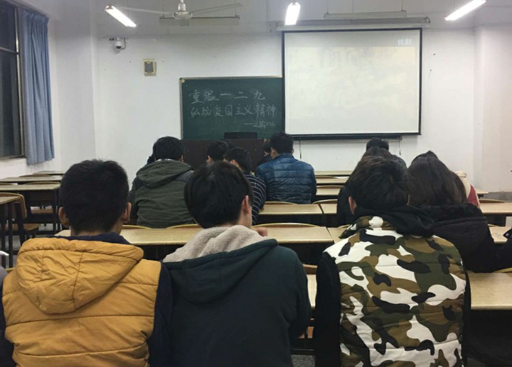 运输1152班参加了本次团日活动,活动以播放视频的形式向同学们介绍“一二九”员工运动的历史情况,指出了其对抗日民族统一战线形成的重要意义,点明了当代员工需要且应该继承“一二九”运动精神。伴随着视频中内容的层层深入,同学们一次次地被带入高潮,在座的每位同学都被先辈们的爱国精神所感染。