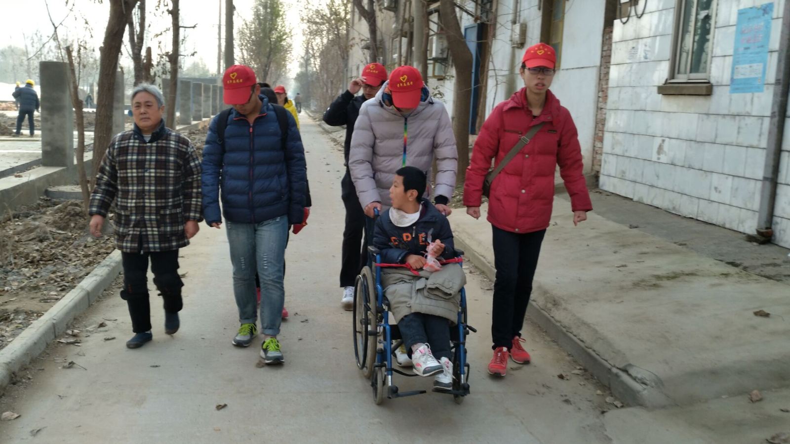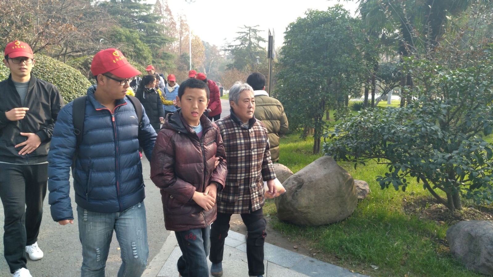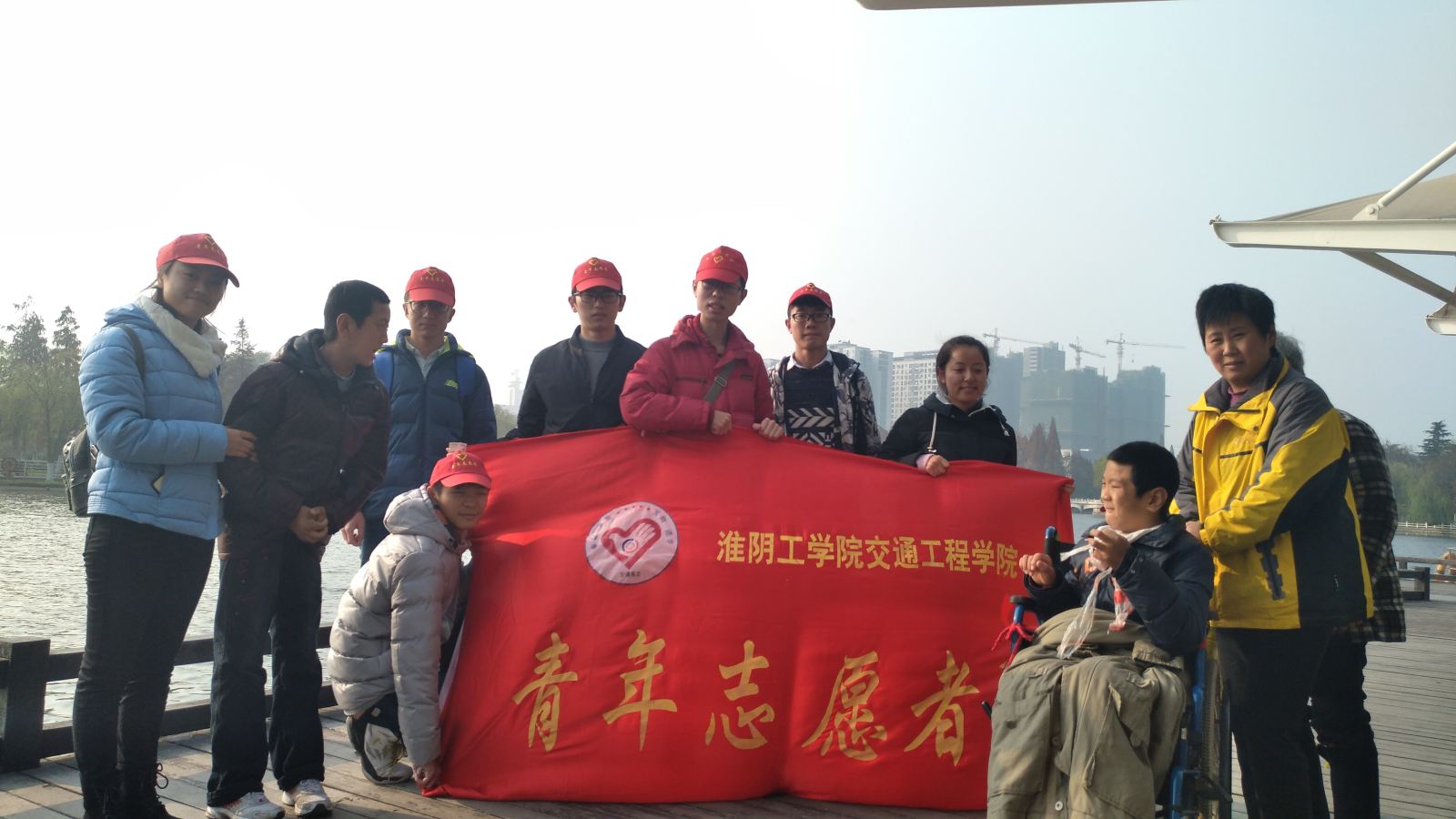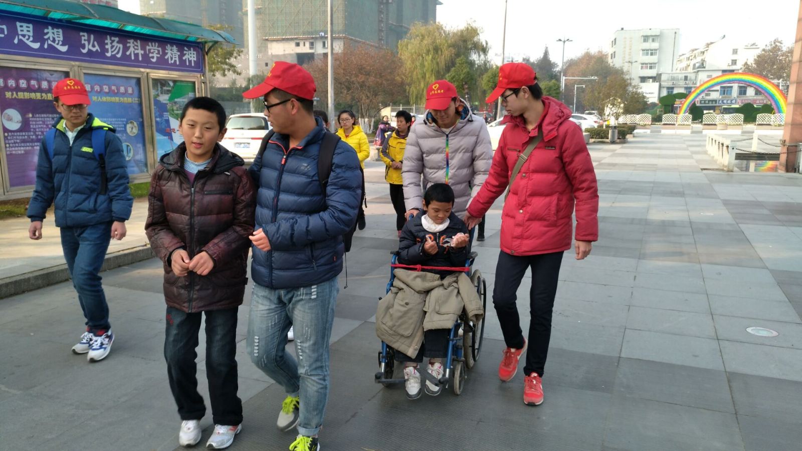 青志队员利用周末课余时间帮助两个不能正常行走的特殊儿童到楚秀园游玩,享受他们年龄该有的童趣。志愿者们与孩子的家长相互交谈,了解孩子的现状和家庭情况,志愿者们轮流搀扶孩子和推轮椅,减轻家长的负担并与孩子们玩耍,共度美好时光。志愿者从蔬菜村乘坐公交到达楚秀园,带着孩子们游玩公园,观赏美丽的风景。游玩过后,志愿者们将孩子们成功送回家。
